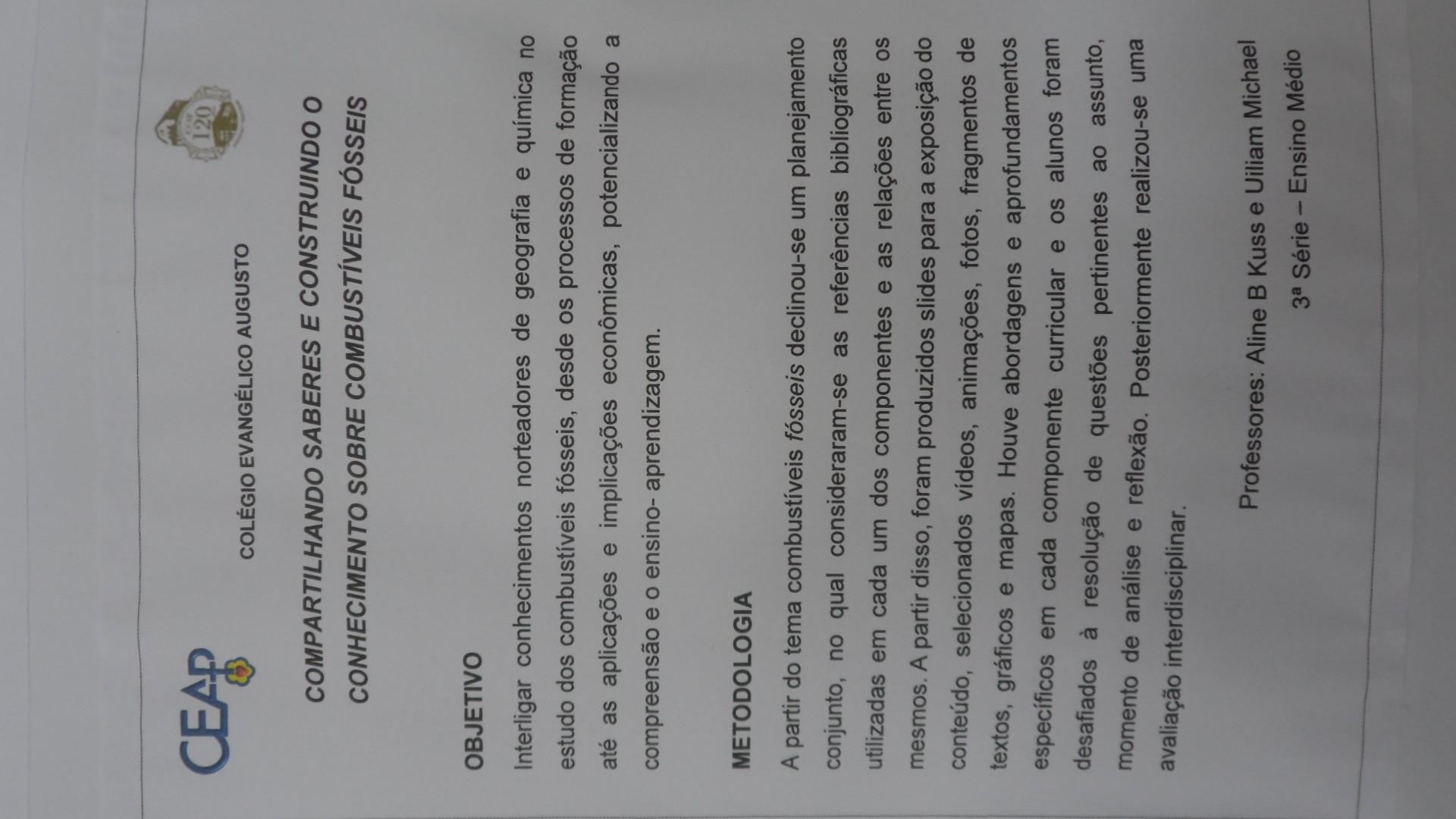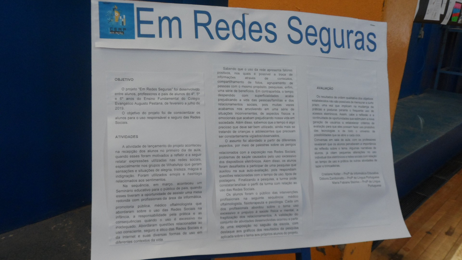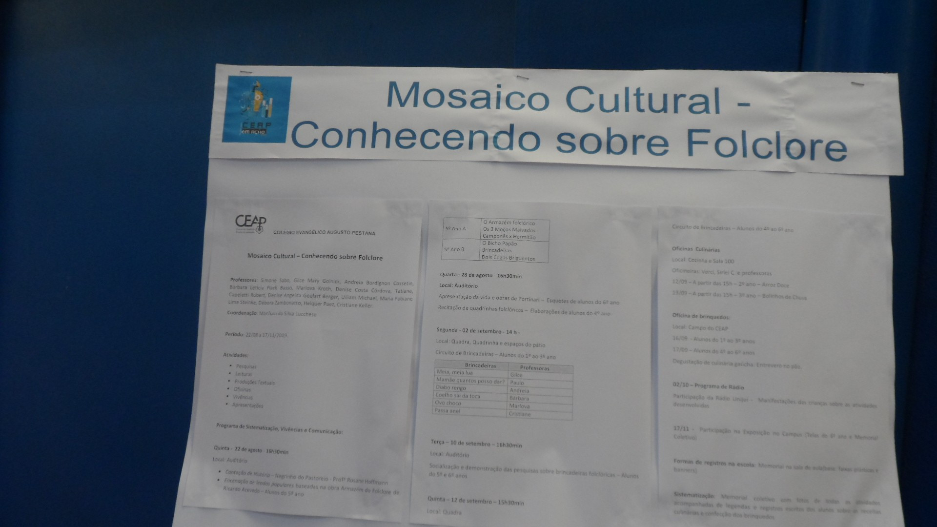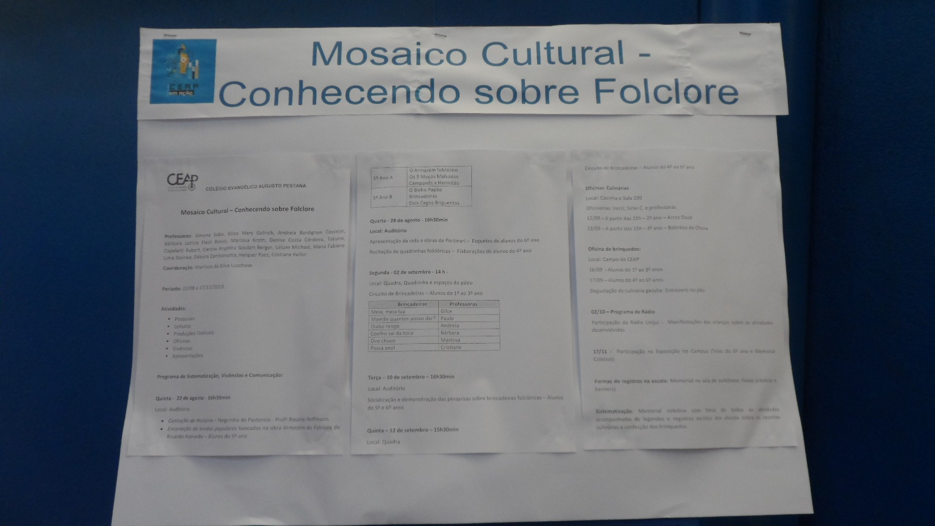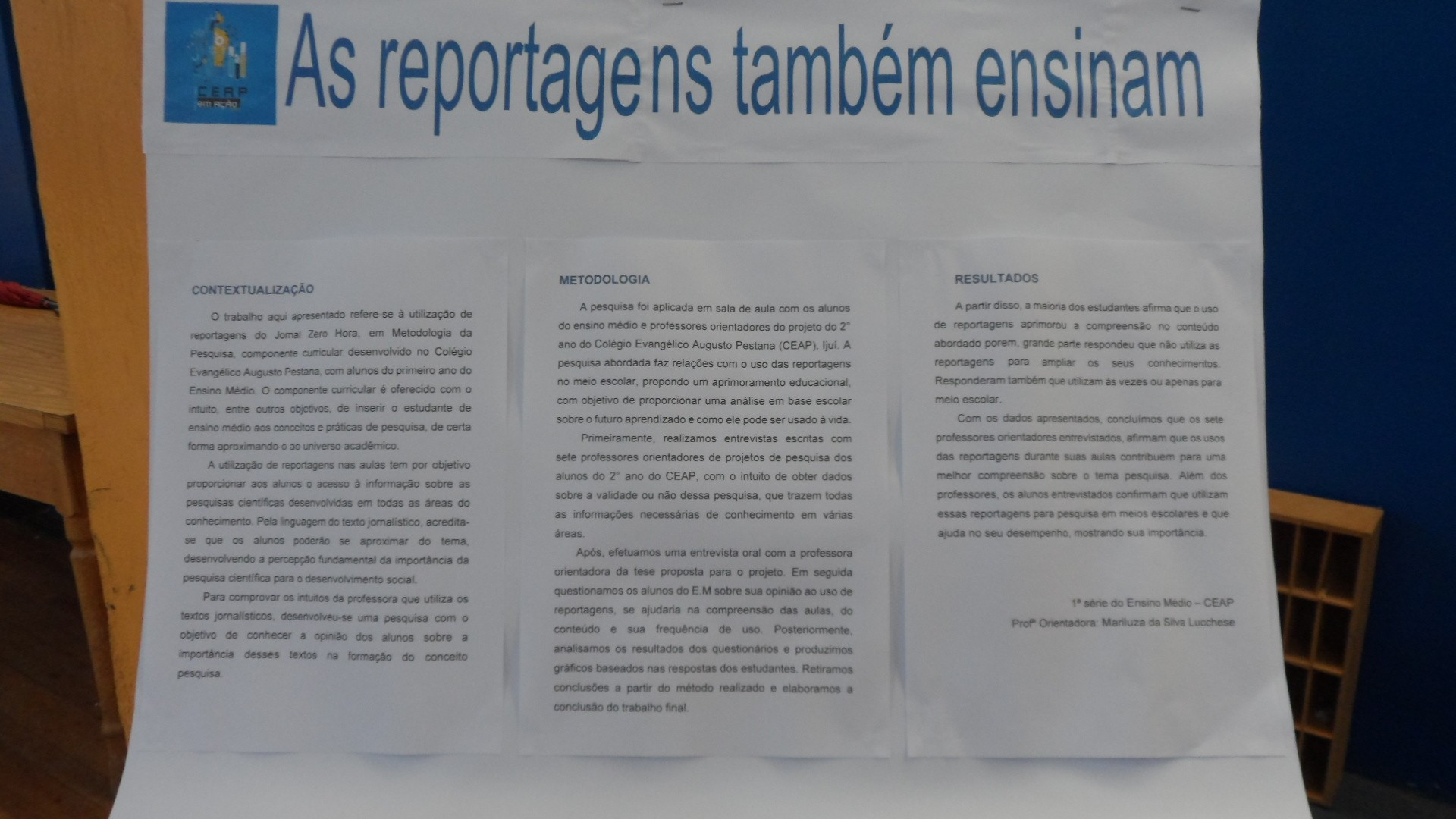 O CEAP em Ação aconteceu no dia 3 de outubro, na quadra de esporte da escola e contou também com a participação de trabalhos apresentados por outros grupos neste ano. Além dos colegas do CEAP, também prestigiaram a produção dos estudantes da 2ª série do Ensino Médio do CEAP, alunos de escolas convidadas como: 25 de julho, Tiradentes, Ruizão e Adventista.