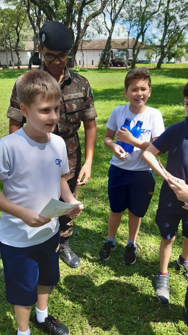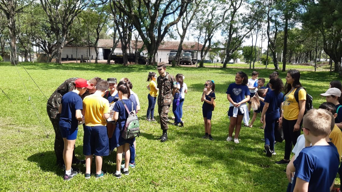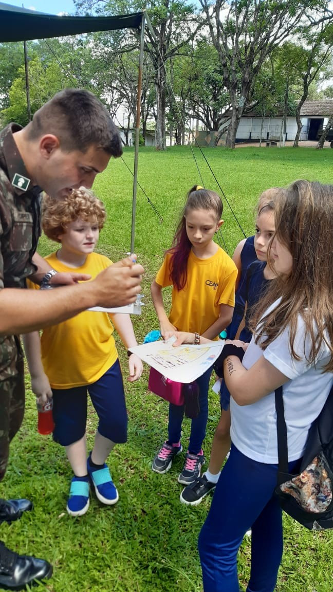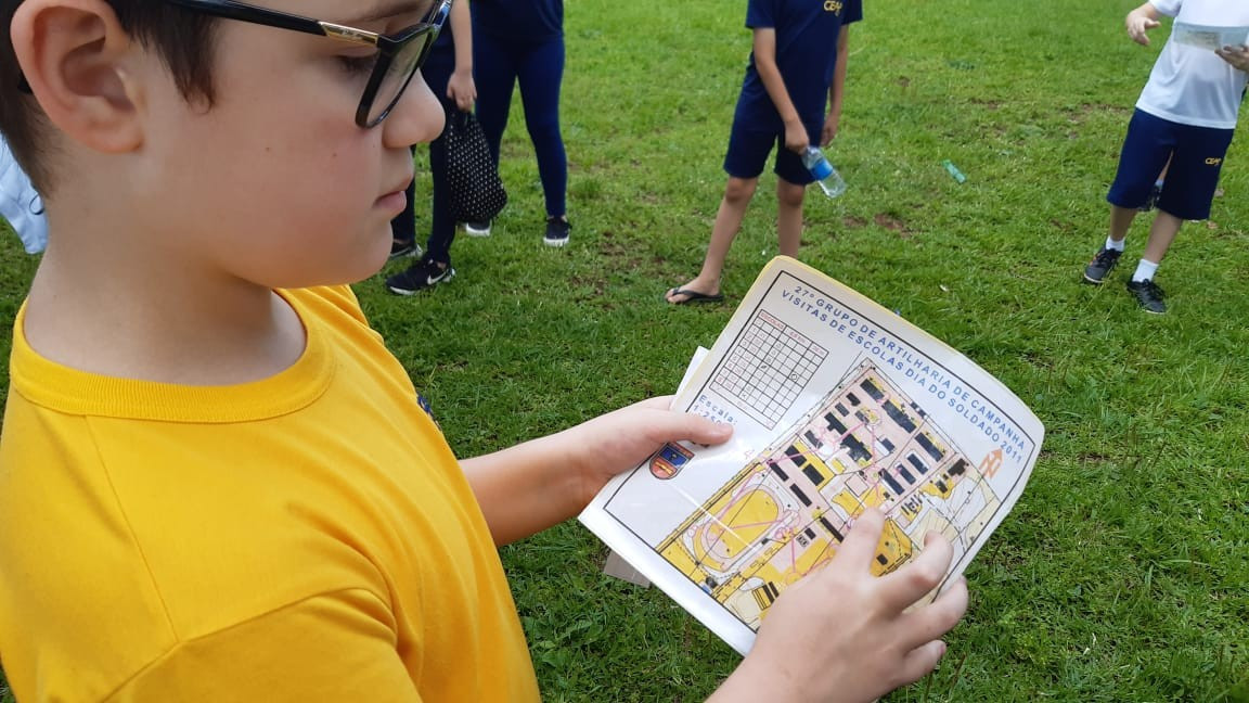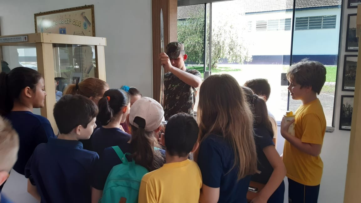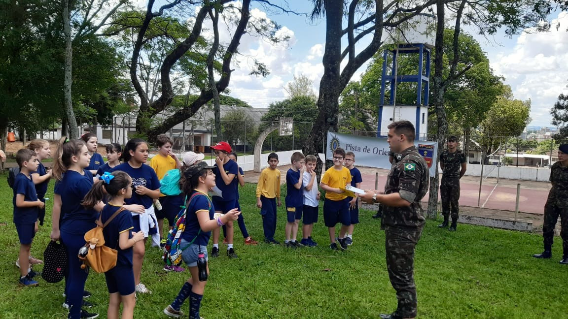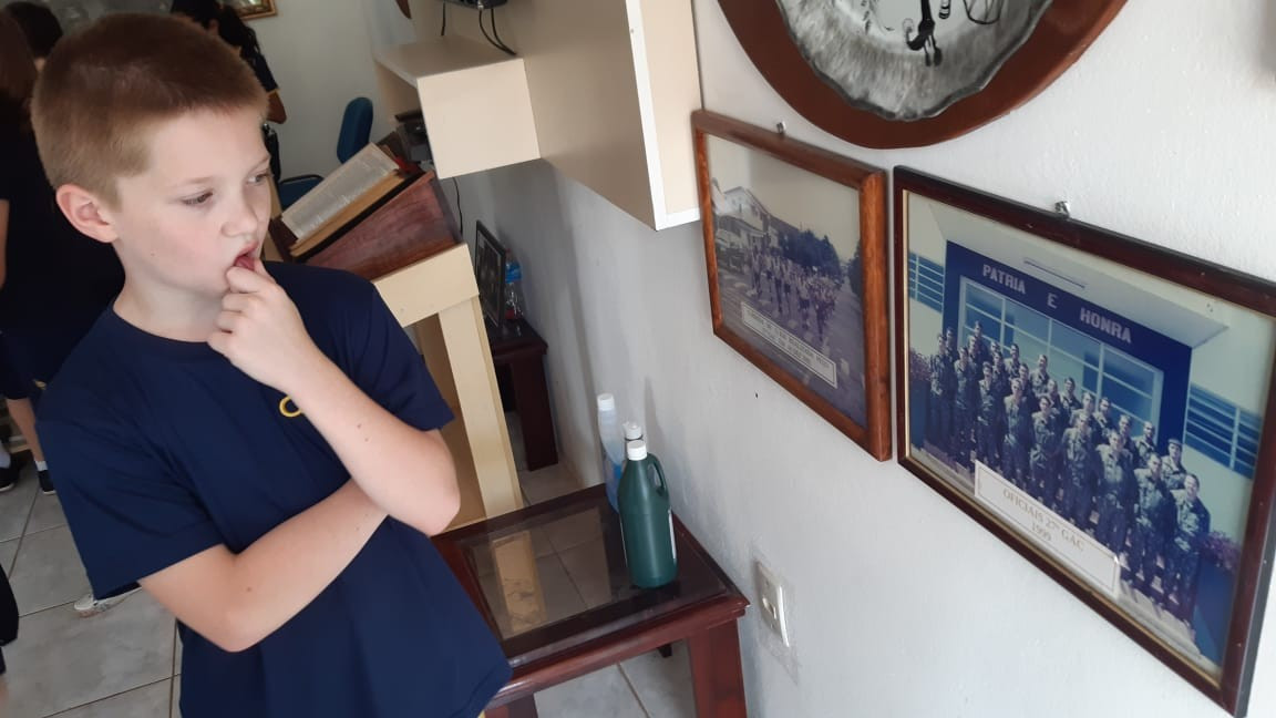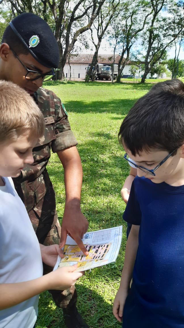 Na quinta, dia 14, as crianças do 4º ano realizaram uma visita de estudos ao Quartel do 27º GAC de Ijuí para uma atividade de orientação. A primeira ação foi conhecer as instalações do Museu, após, participaram de um passeio guiado que exigia a realização de tarefas.