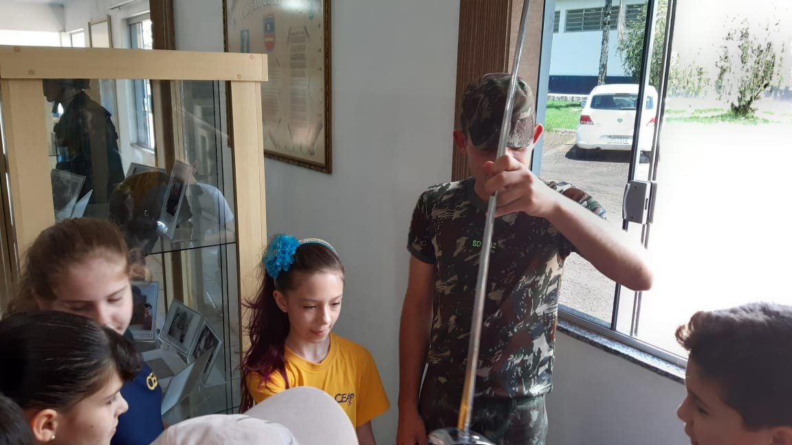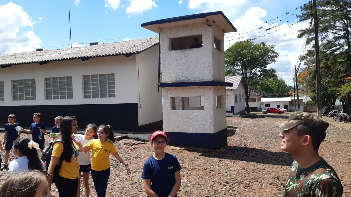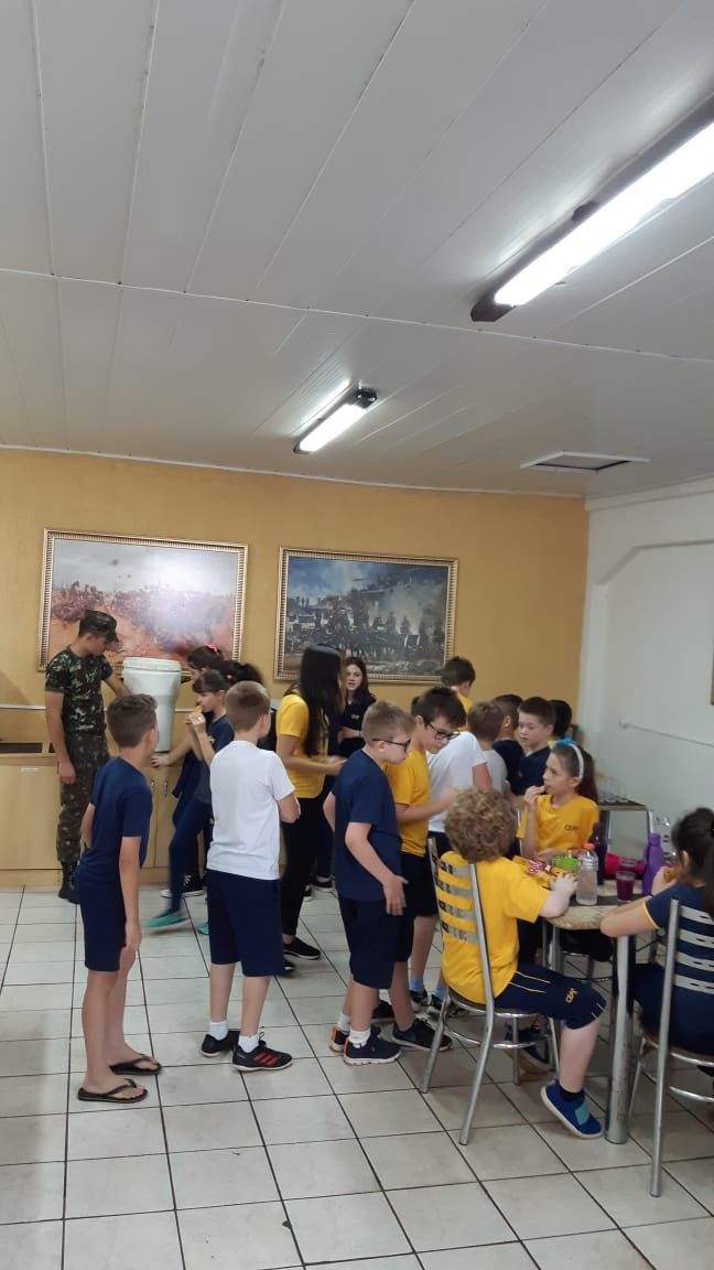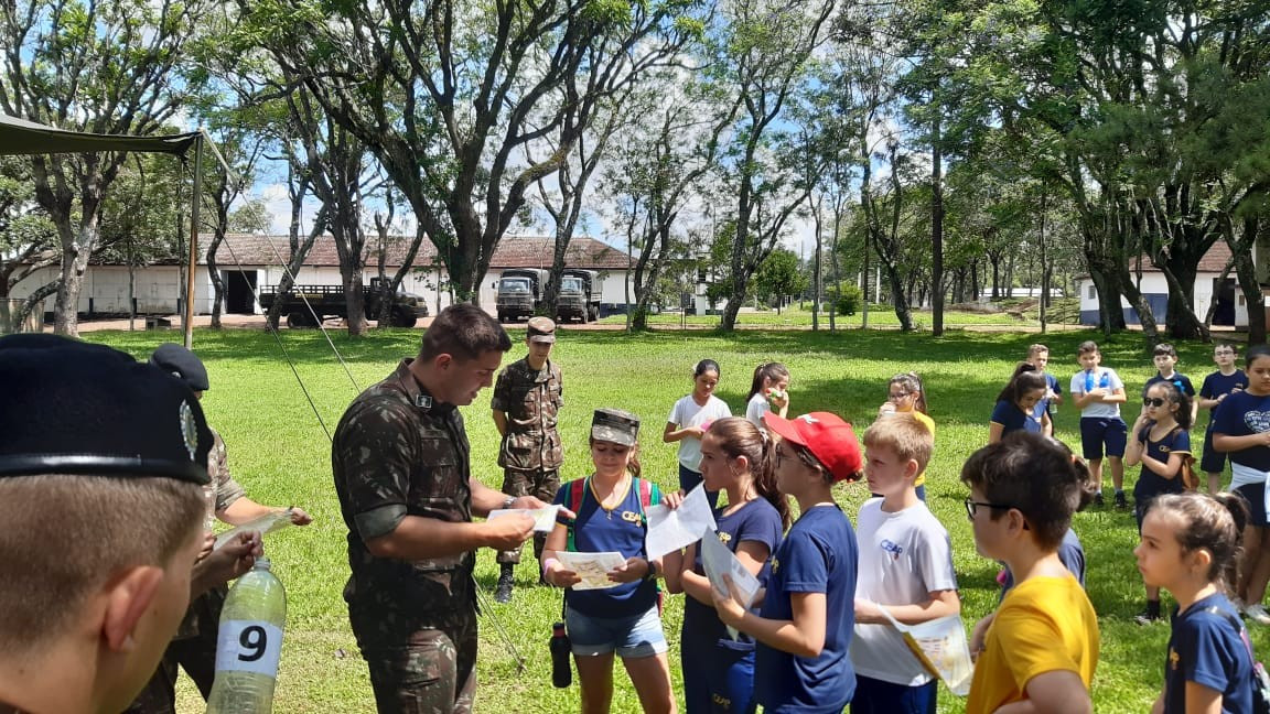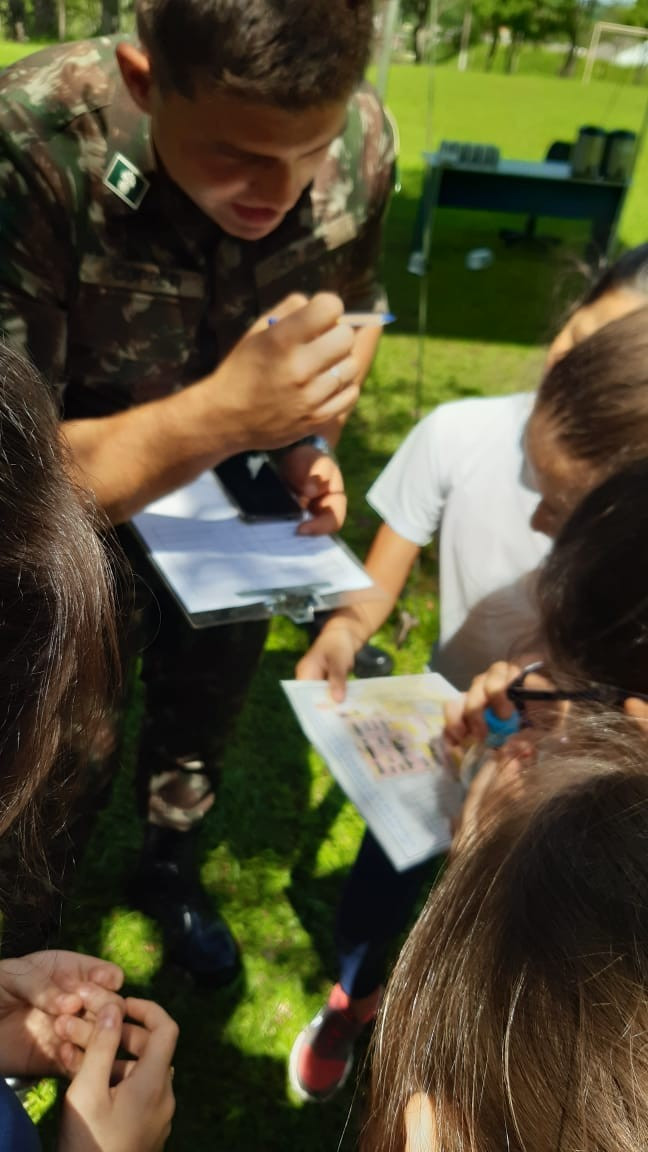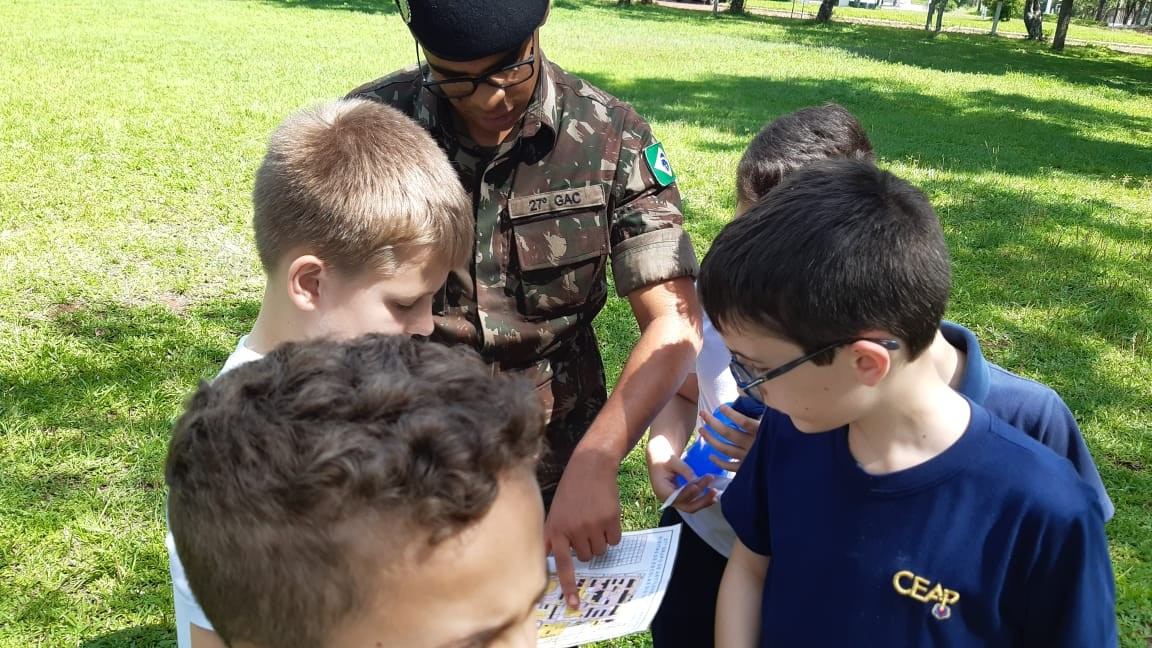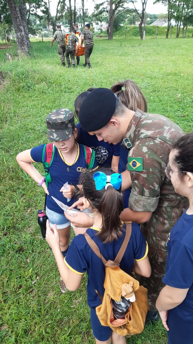 Na quinta, dia 14, as crianças do 4º ano realizaram uma visita de estudos ao Quartel do 27º GAC de Ijuí para uma atividade de orientação. A primeira ação foi conhecer as instalações do Museu, após, participaram de um passeio guiado que exigia a realização de tarefas.