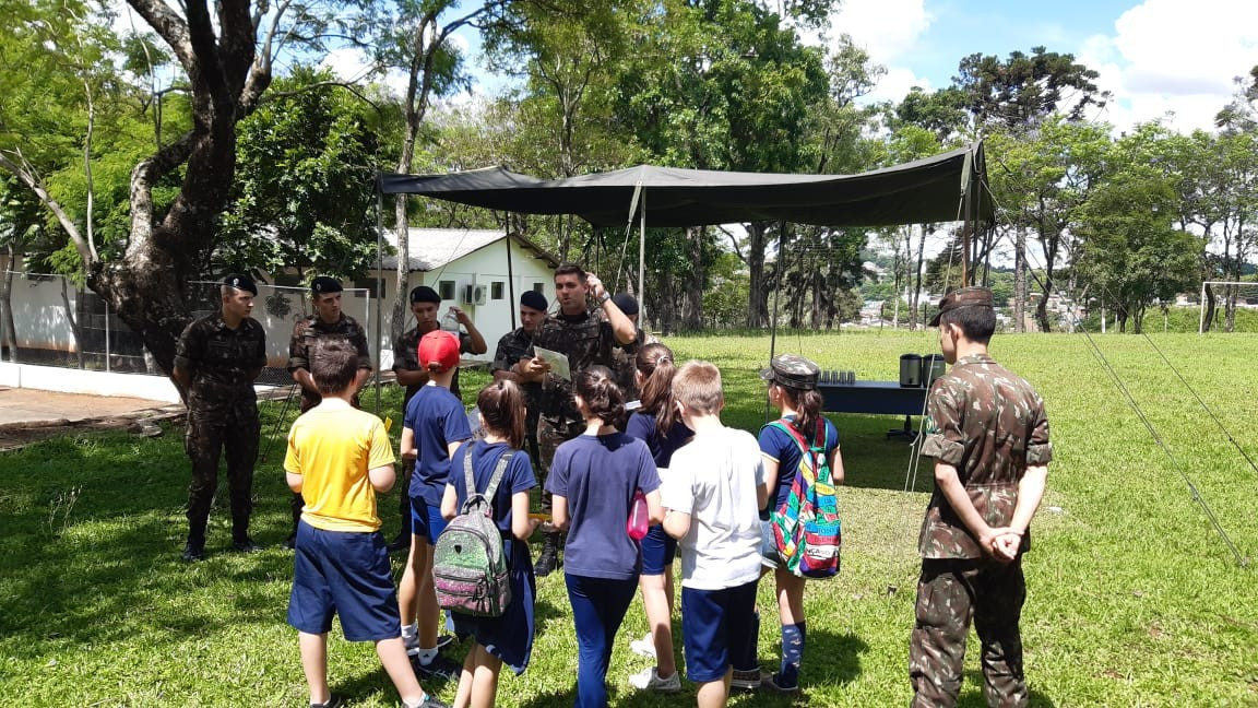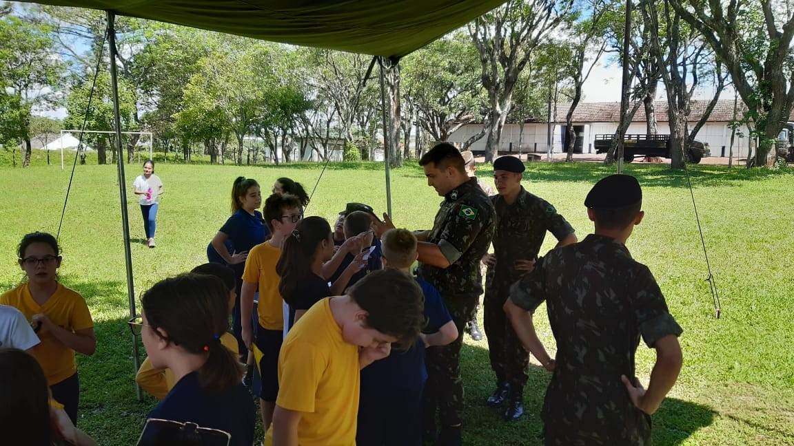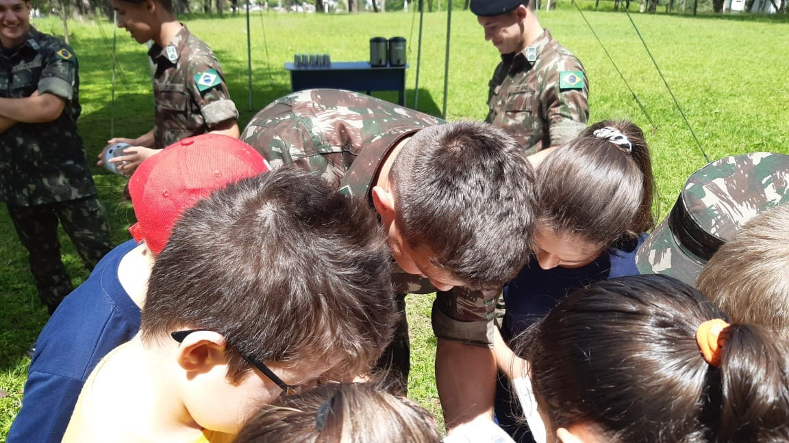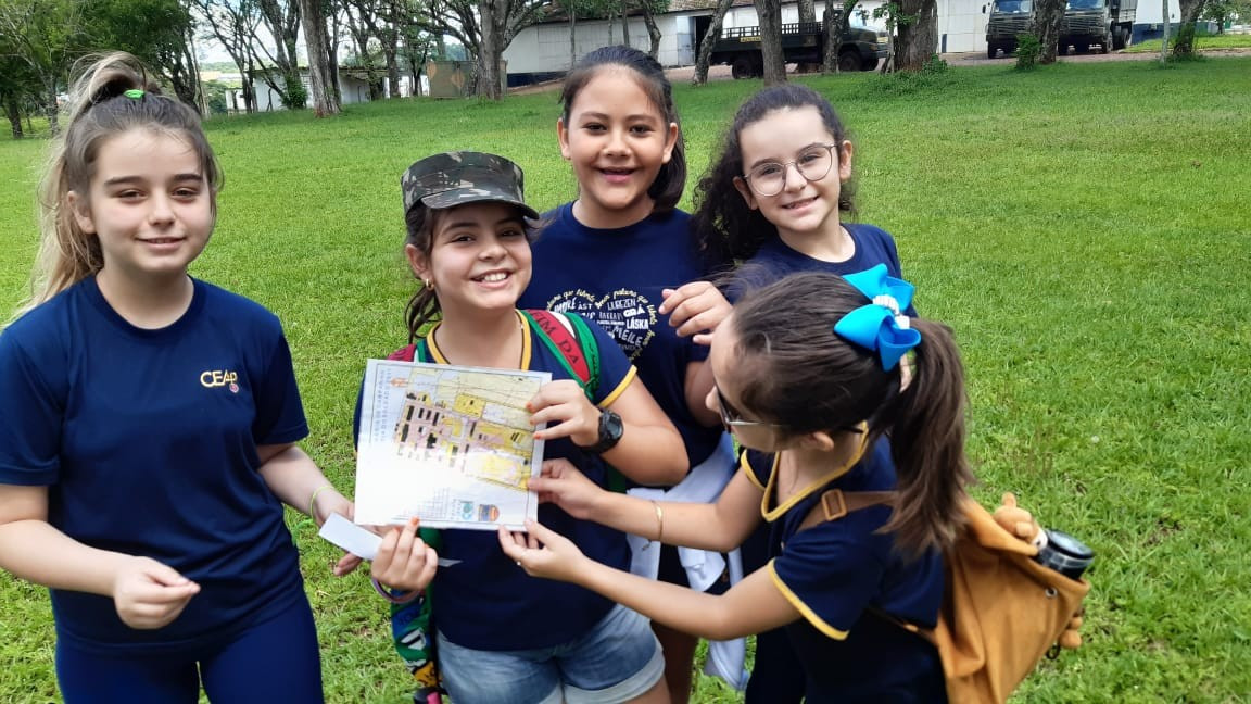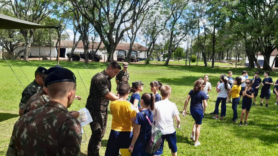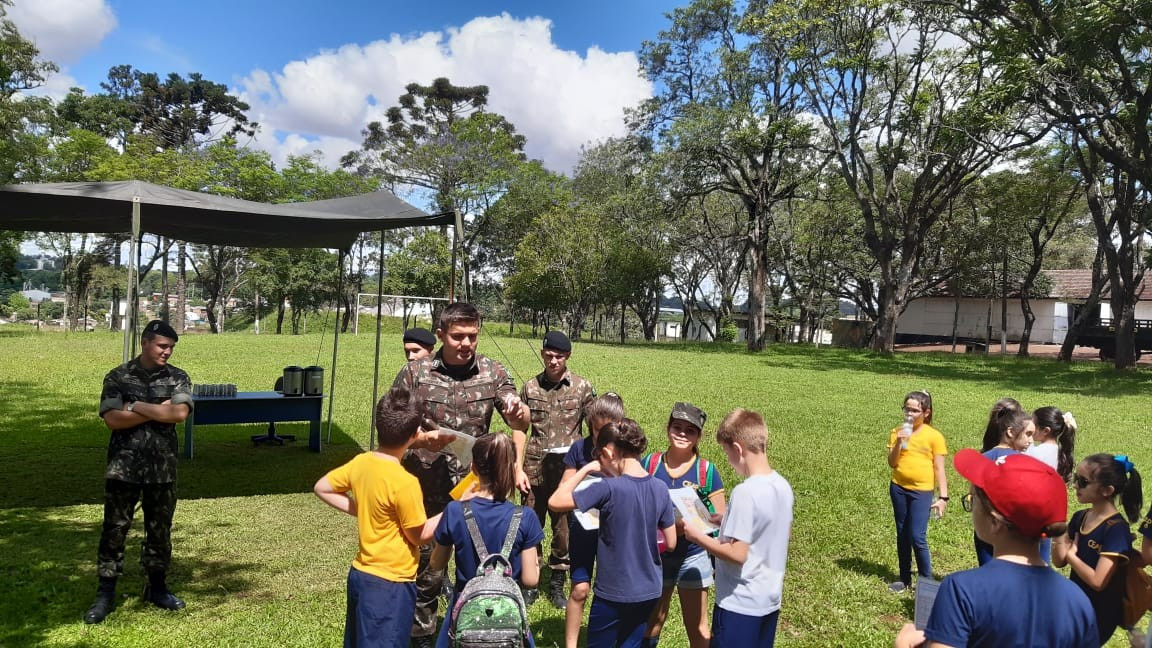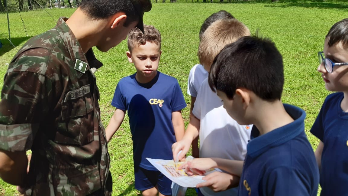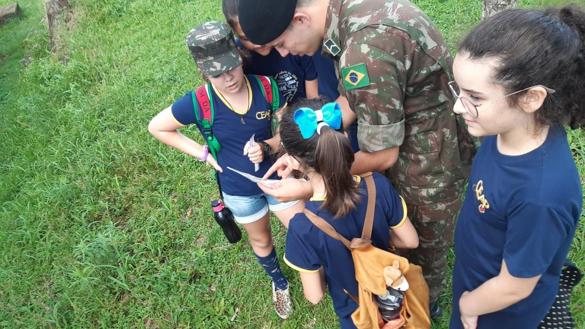 Na quinta, dia 14, as crianças do 4º ano realizaram uma visita de estudos ao Quartel do 27º GAC de Ijuí para uma atividade de orientação. A primeira ação foi conhecer as instalações do Museu, após, participaram de um passeio guiado que exigia a realização de tarefas.