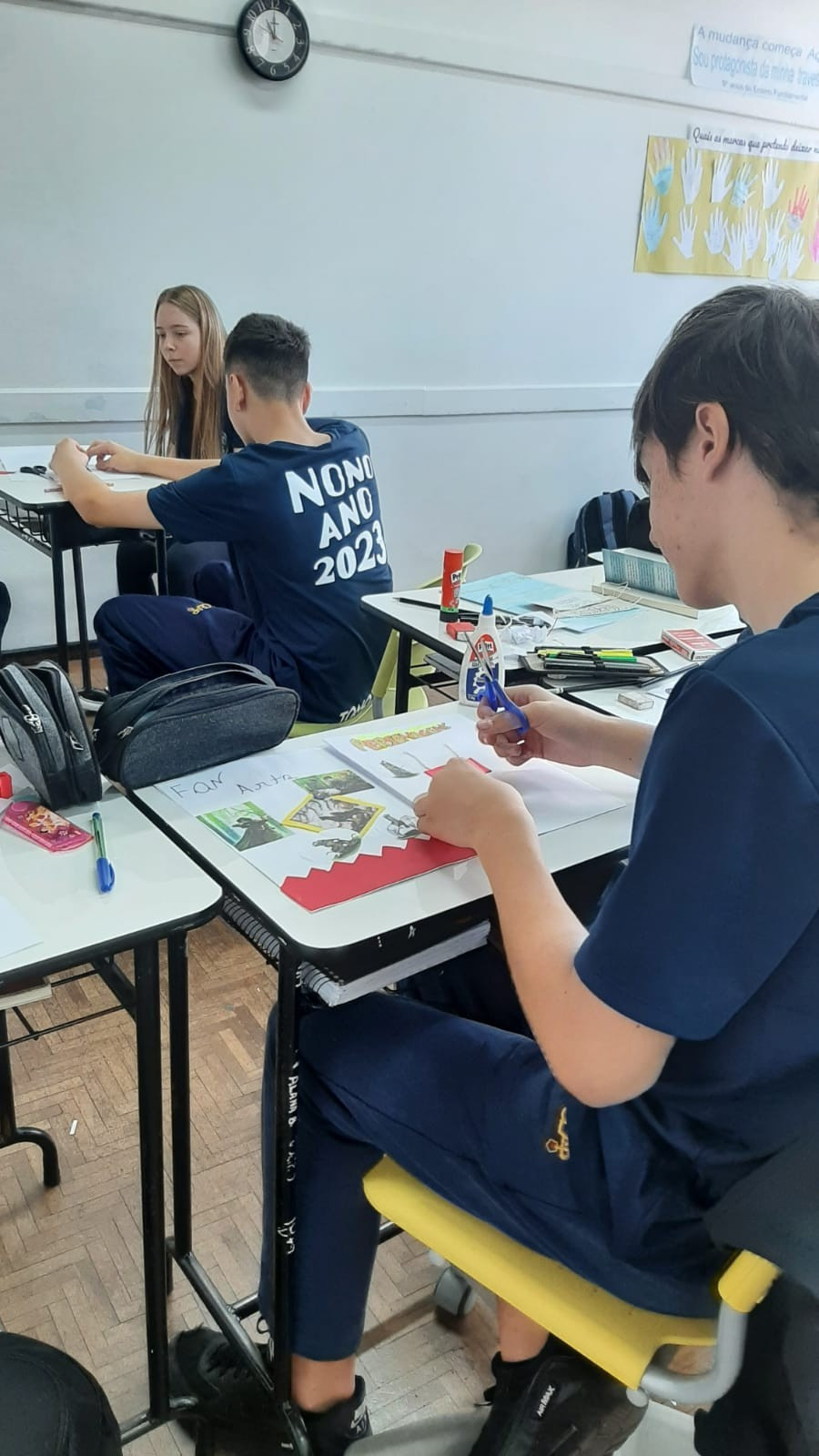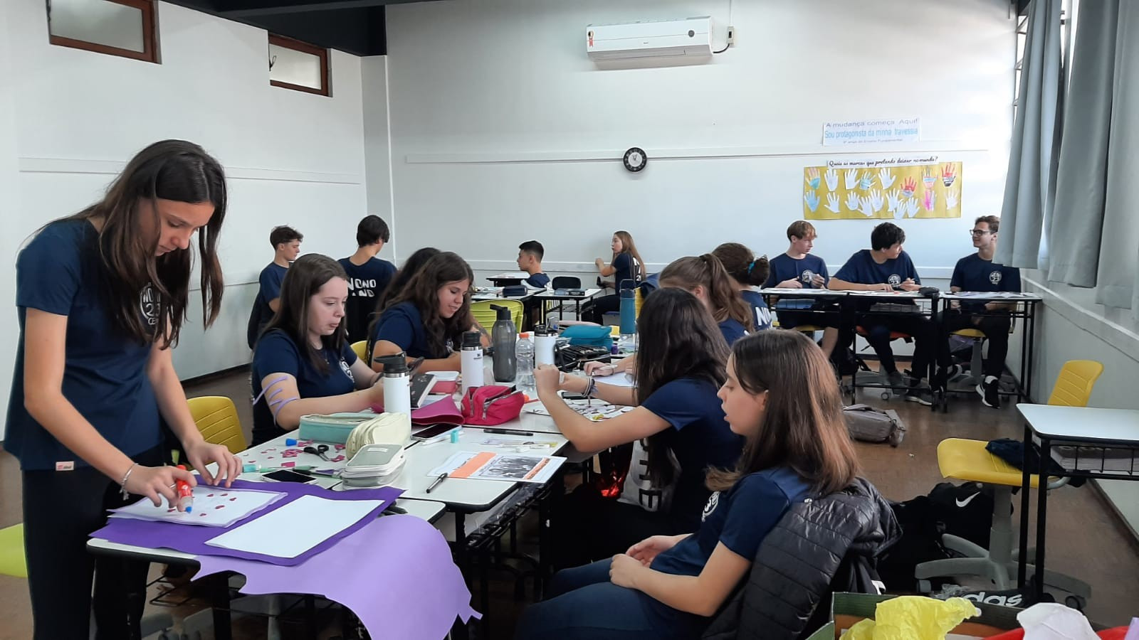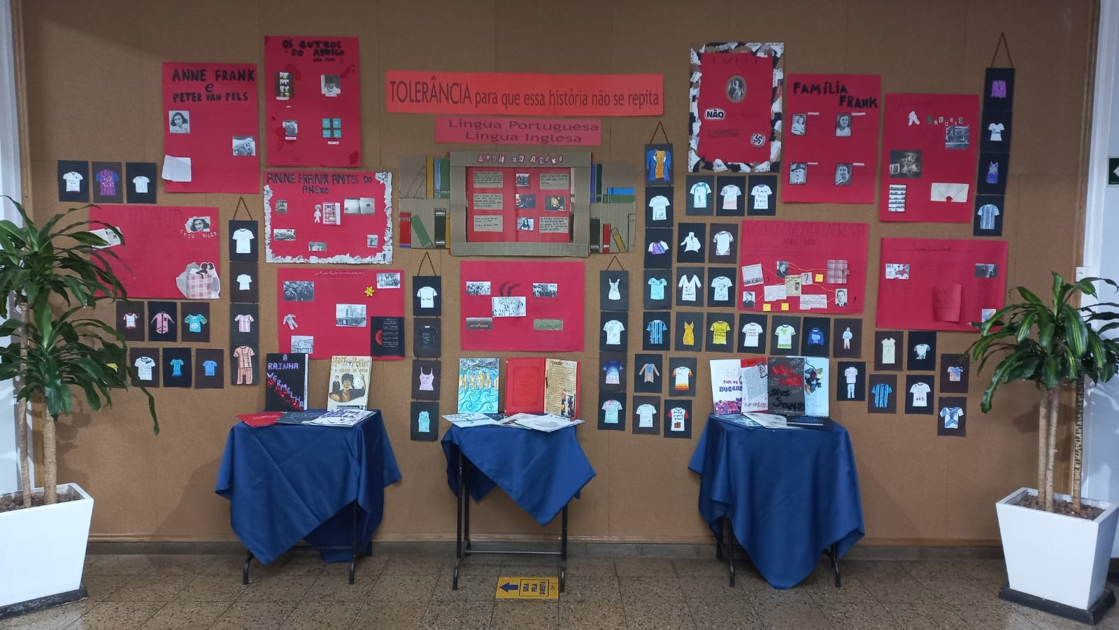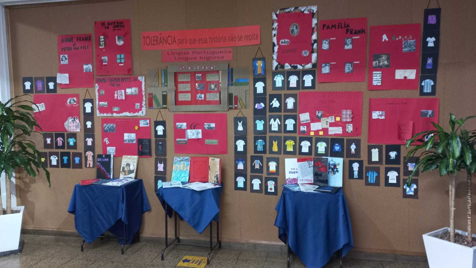 A exposição no saguão principal da escola é fruto da roda de conversa em sala de aula em que os estudantes foram desafiados a compartilhar seus medos e preocupações referentes aos últimos acontecimentos em nossa sociedade, envolvendo a questão da violência. O objetivo nesse momento é assegurar que todos os alunos consigam trazer manifestações sobre suas atitudes, anseios e pensamentos sobre o que vem acontecendo, e trabalhar/enfatizar o respeito aos colegas e professores.