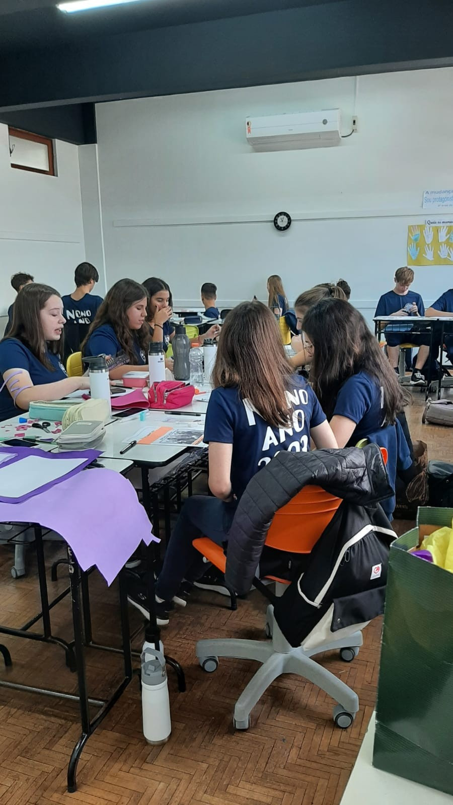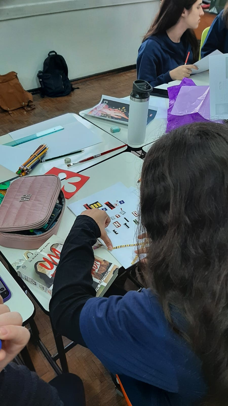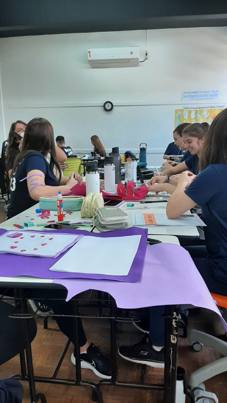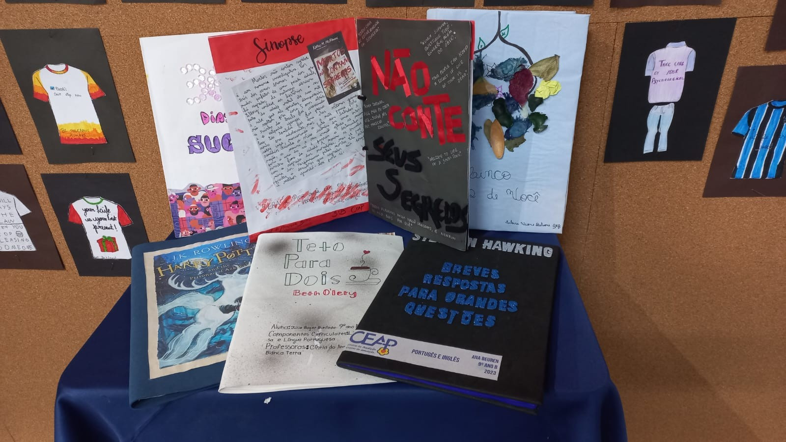 A exposição no saguão principal da escola é fruto da roda de conversa em sala de aula em que os estudantes foram desafiados a compartilhar seus medos e preocupações referentes aos últimos acontecimentos em nossa sociedade, envolvendo a questão da violência. O objetivo nesse momento é assegurar que todos os alunos consigam trazer manifestações sobre suas atitudes, anseios e pensamentos sobre o que vem acontecendo, e trabalhar/enfatizar o respeito aos colegas e professores.