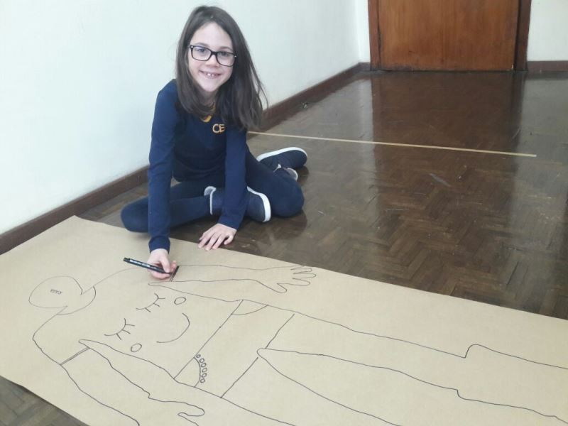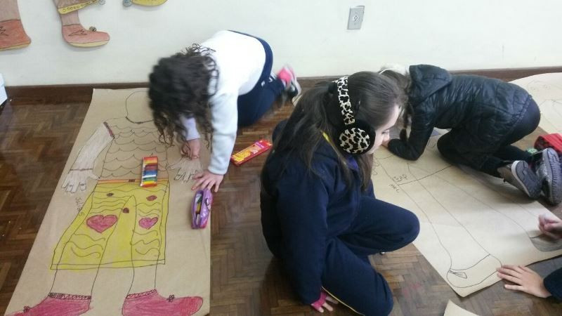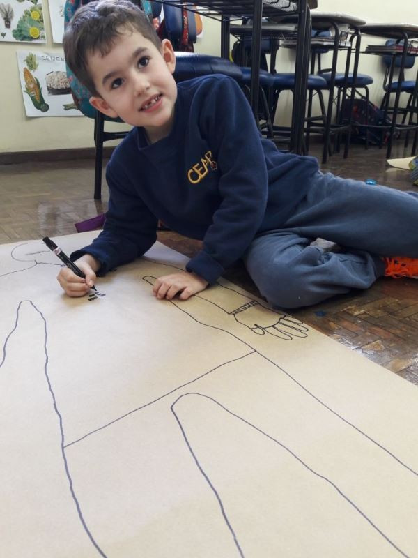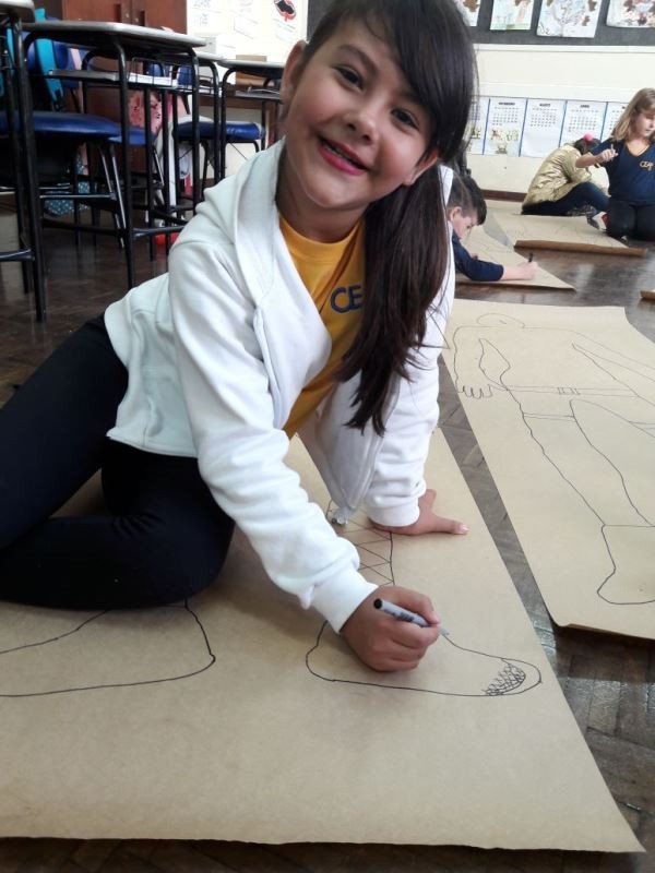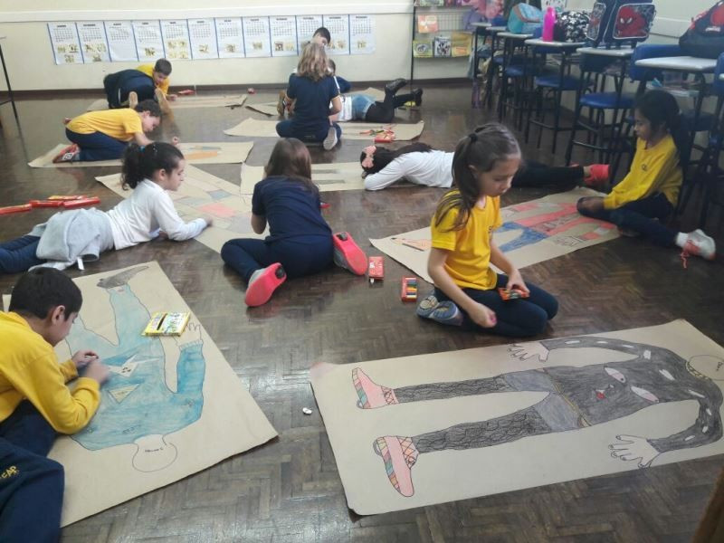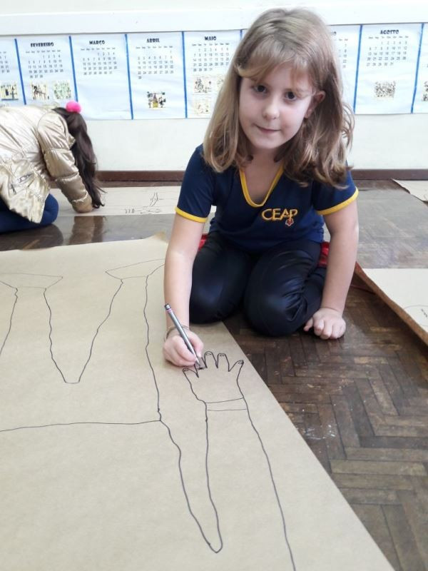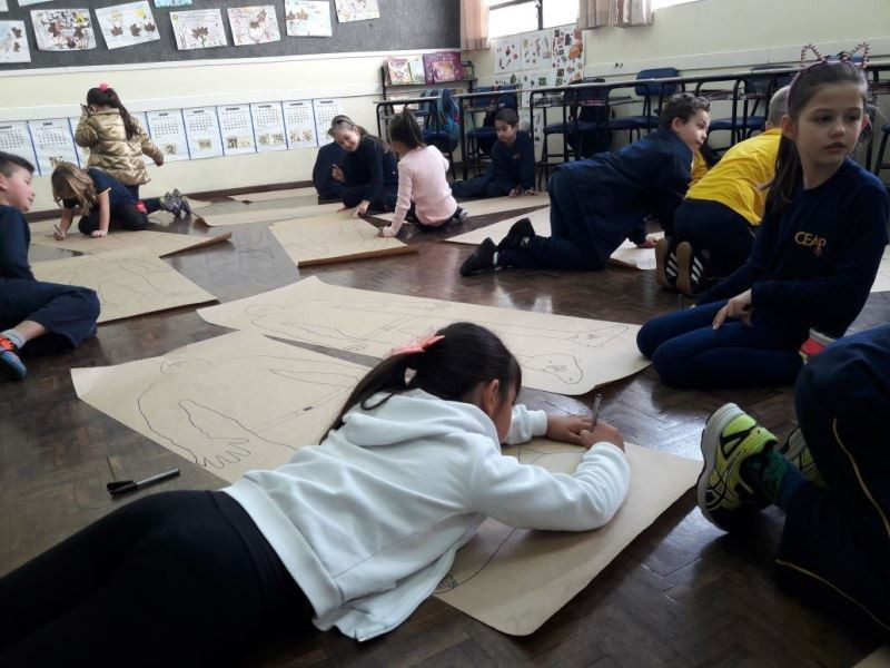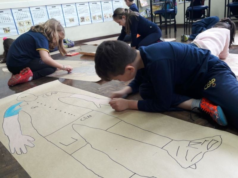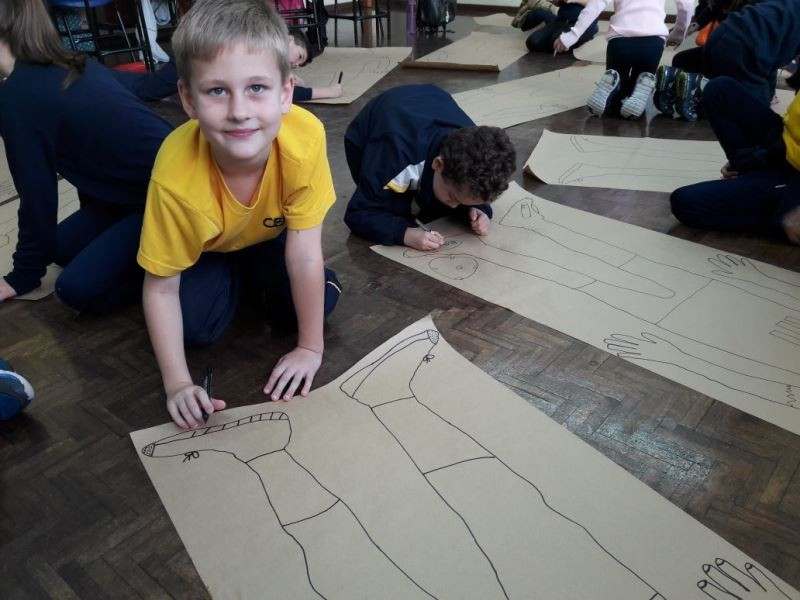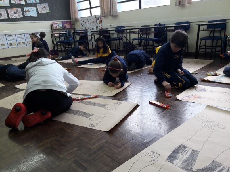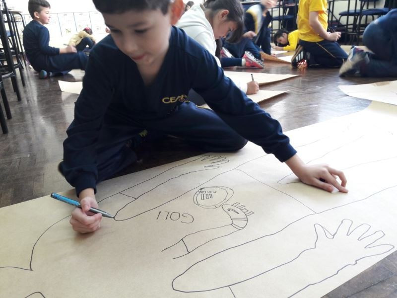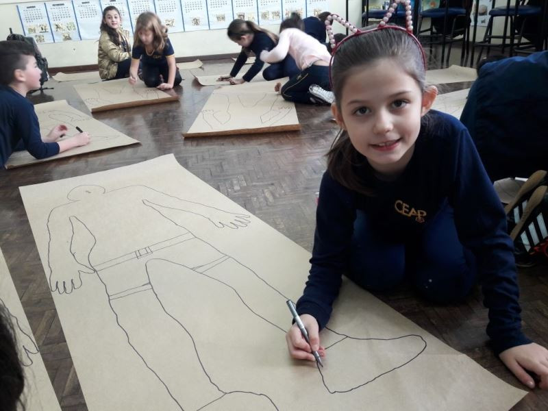 Os alunos do 2º ano do Ensino Fundamental seguem explorando a literatura “E algo aconteceu naquele dia”, de Jonas Ribeiro. A ideia da corrente do bem está tendo sequência, agora, com uma atividade que irá culminar com uma grande exposição. Cada criança fez, em papel pardo, o contorno do próprio corpo, em tamanho natural. Estão criando detalhes, roupas, acessórios e colorindo. E com todos os desenhos irão representar a corrente do bem da turma, significando amizade, ajuda e companheirismo. A exposição será durante o CEAP Literário.