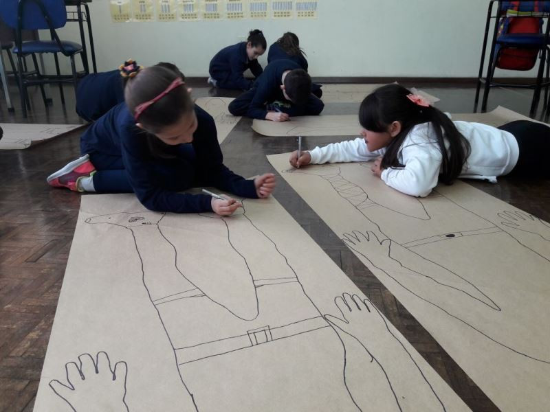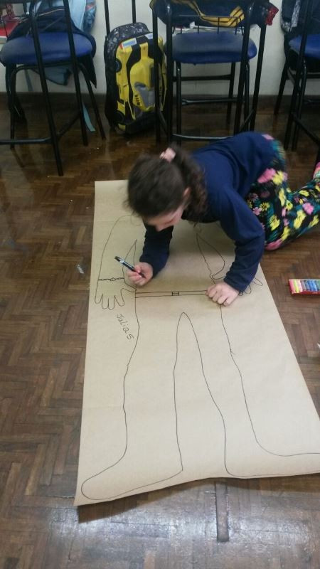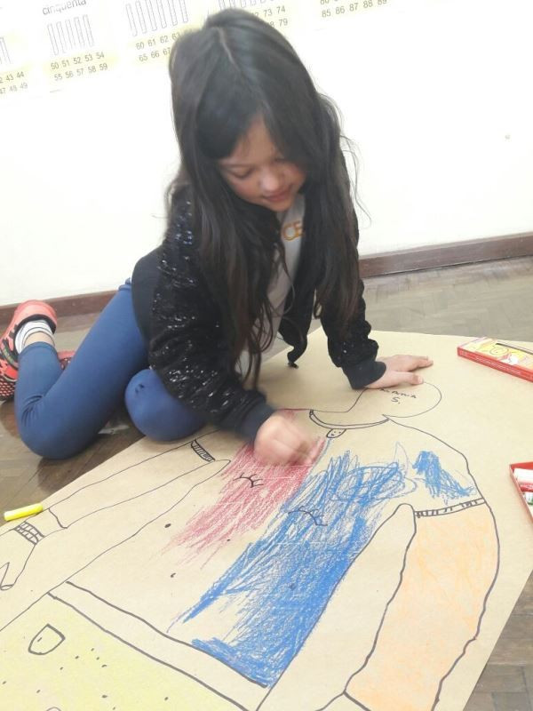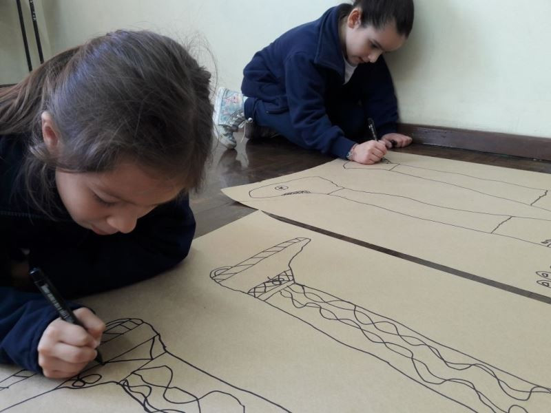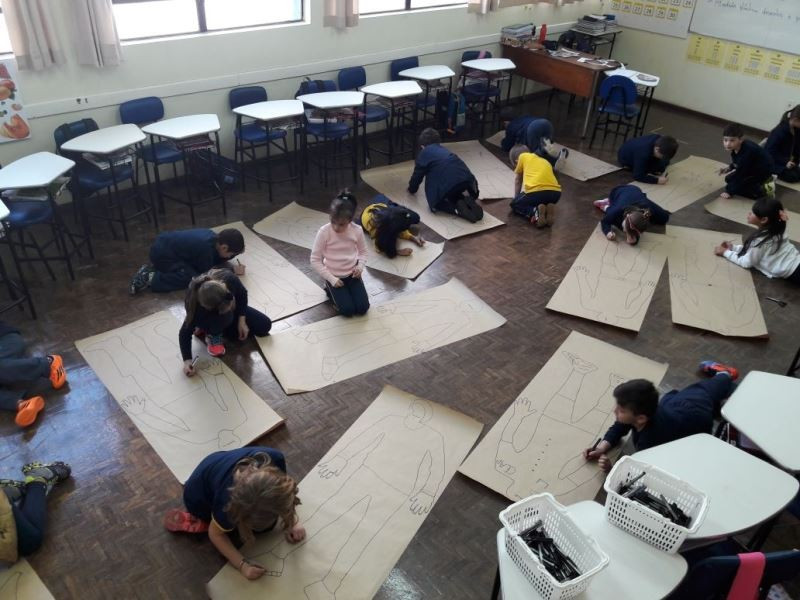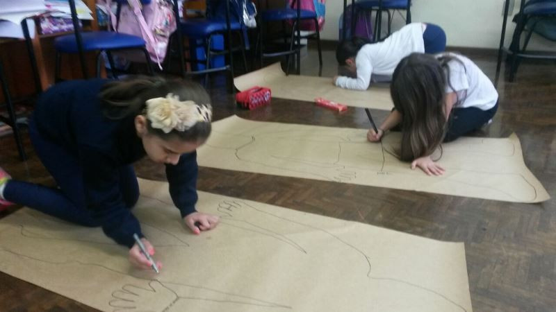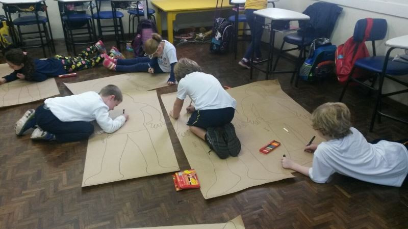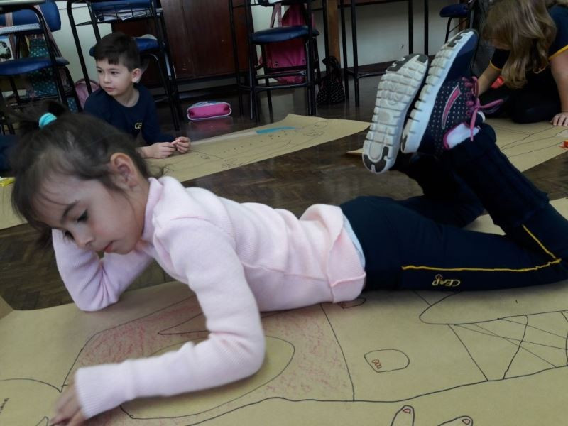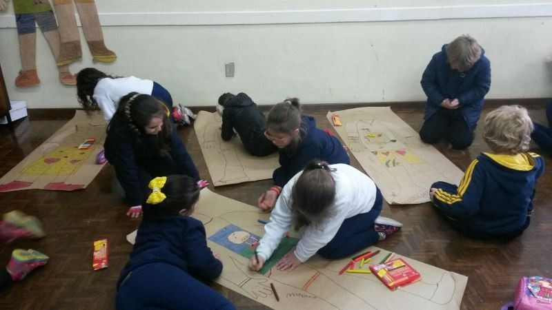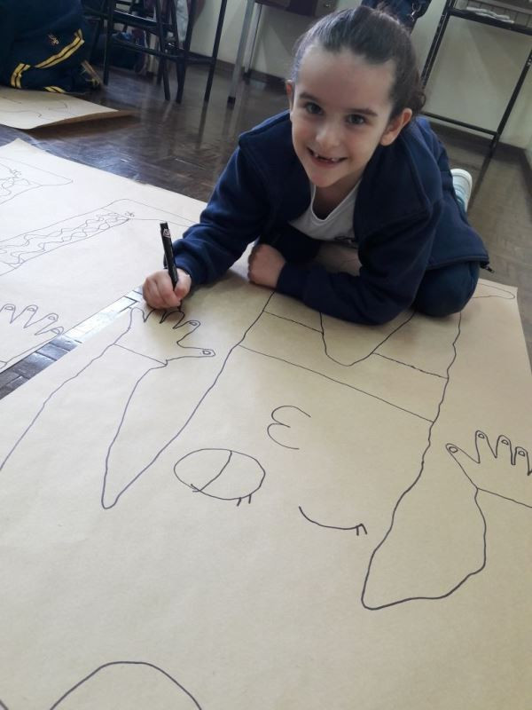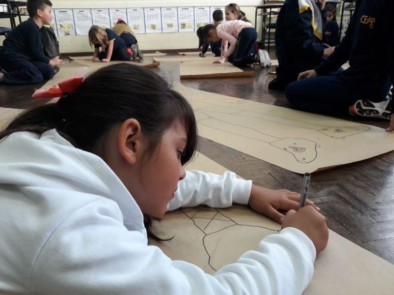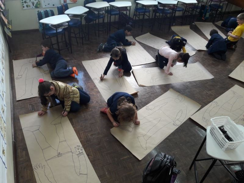 Os alunos do 2º ano do Ensino Fundamental seguem explorando a literatura “E algo aconteceu naquele dia”, de Jonas Ribeiro. A ideia da corrente do bem está tendo sequência, agora, com uma atividade que irá culminar com uma grande exposição. Cada criança fez, em papel pardo, o contorno do próprio corpo, em tamanho natural. Estão criando detalhes, roupas, acessórios e colorindo. E com todos os desenhos irão representar a corrente do bem da turma, significando amizade, ajuda e companheirismo. A exposição será durante o CEAP Literário.