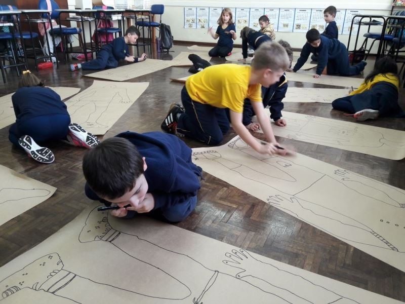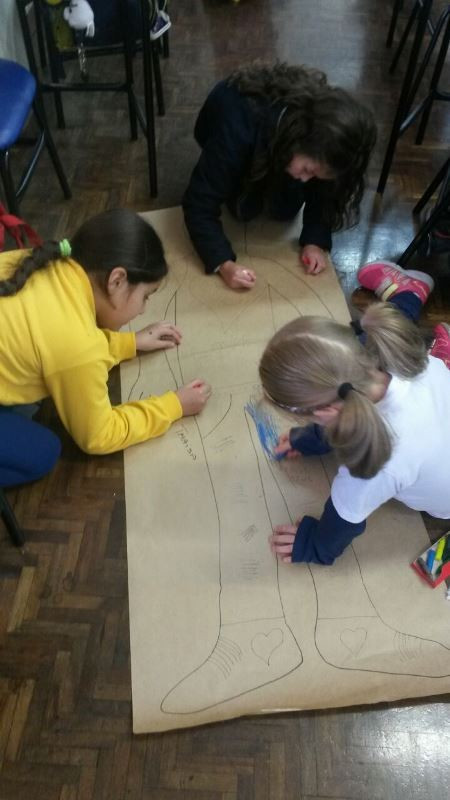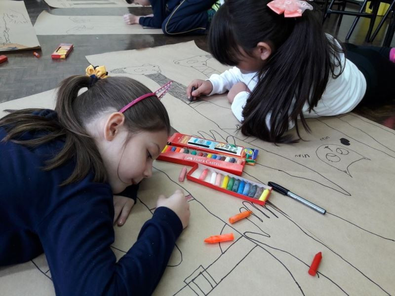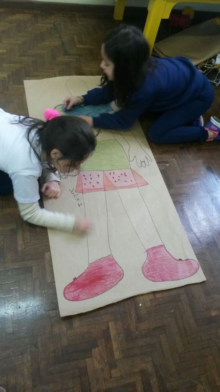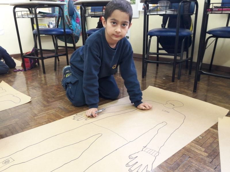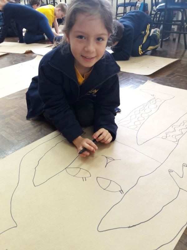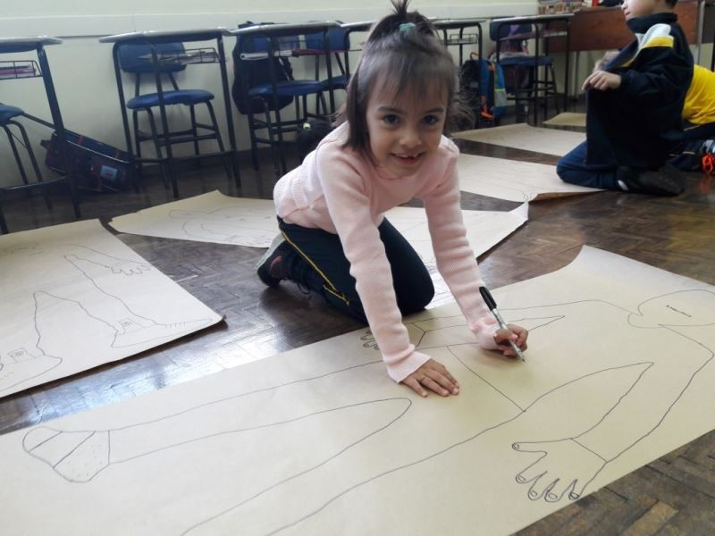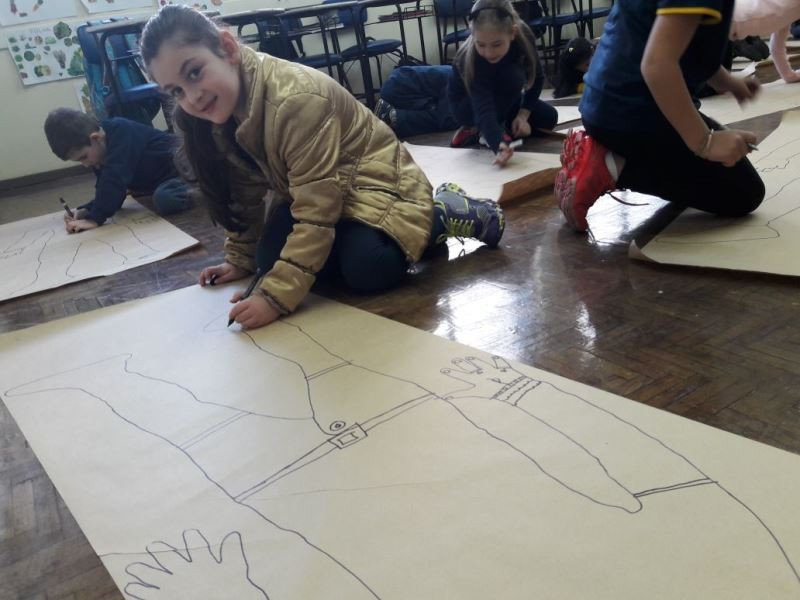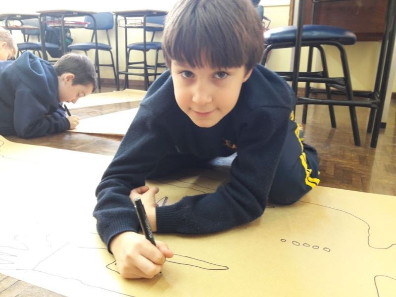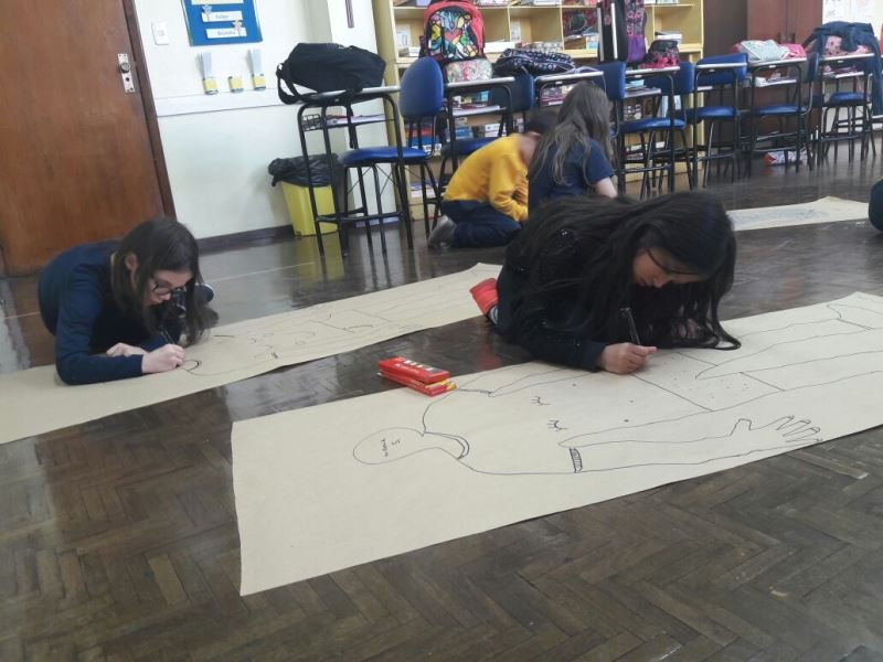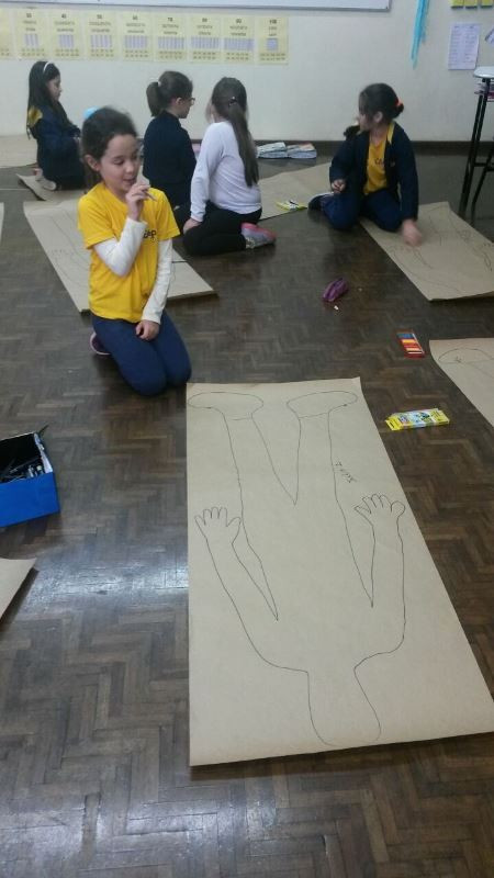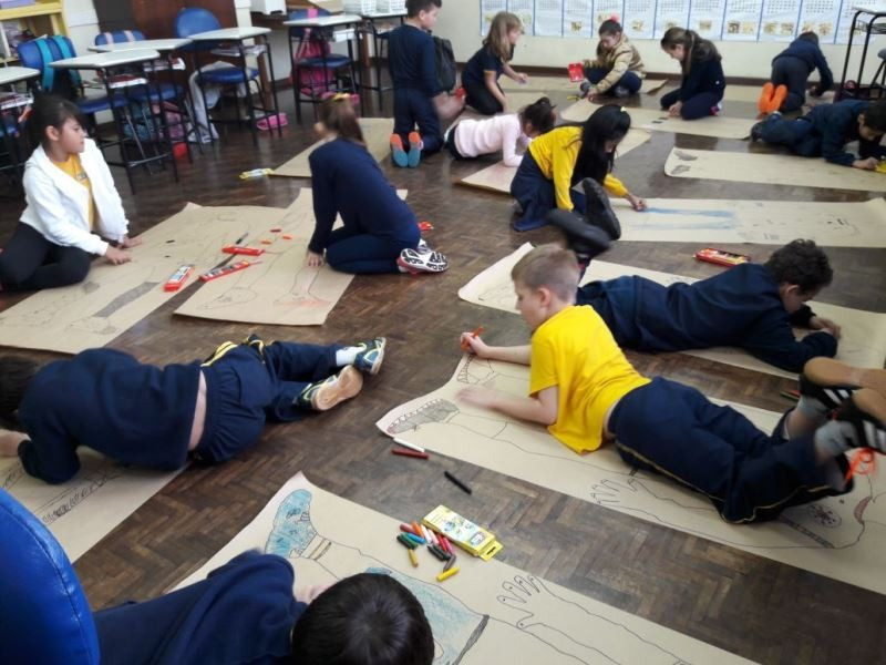Os alunos do 2º ano do Ensino Fundamental seguem explorando a literatura “E algo aconteceu naquele dia”, de Jonas Ribeiro. A ideia da corrente do bem está tendo sequência, agora, com uma atividade que irá culminar com uma grande exposição. Cada criança fez, em papel pardo, o contorno do próprio corpo, em tamanho natural. Estão criando detalhes, roupas, acessórios e colorindo. E com todos os desenhos irão representar a corrente do bem da turma, significando amizade, ajuda e companheirismo. A exposição será durante o CEAP Literário.