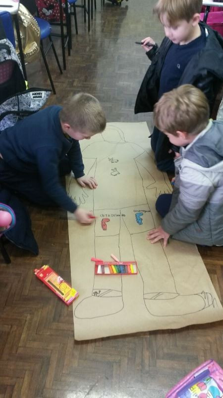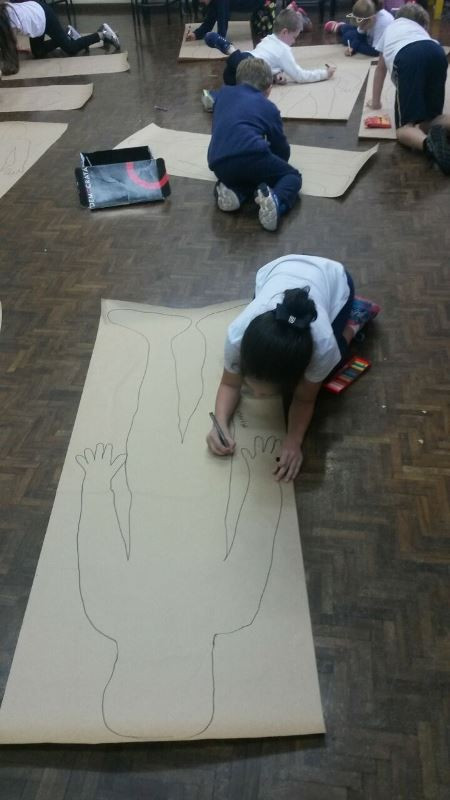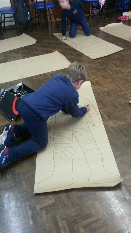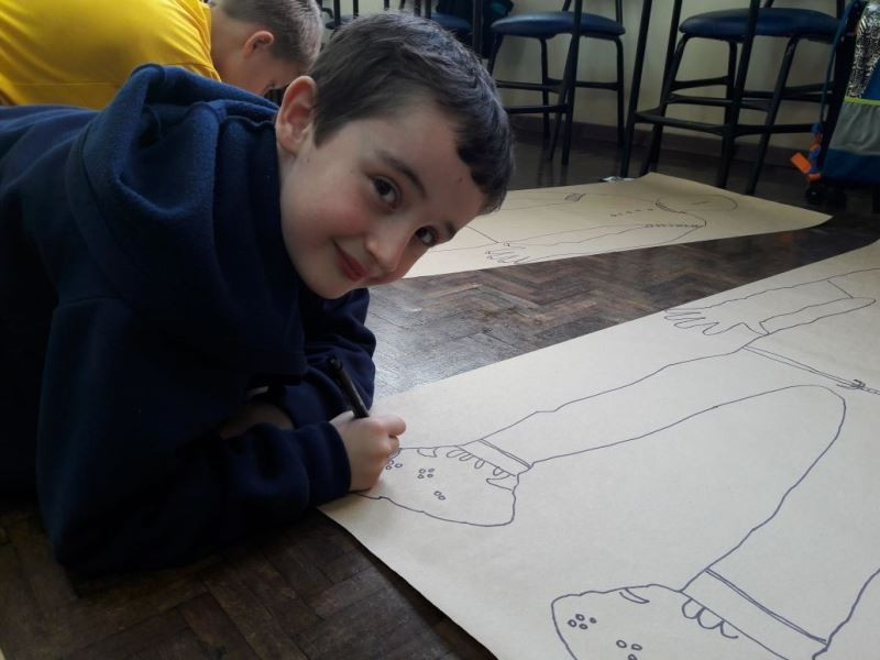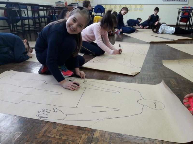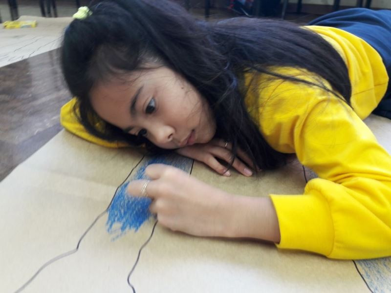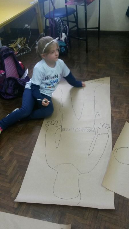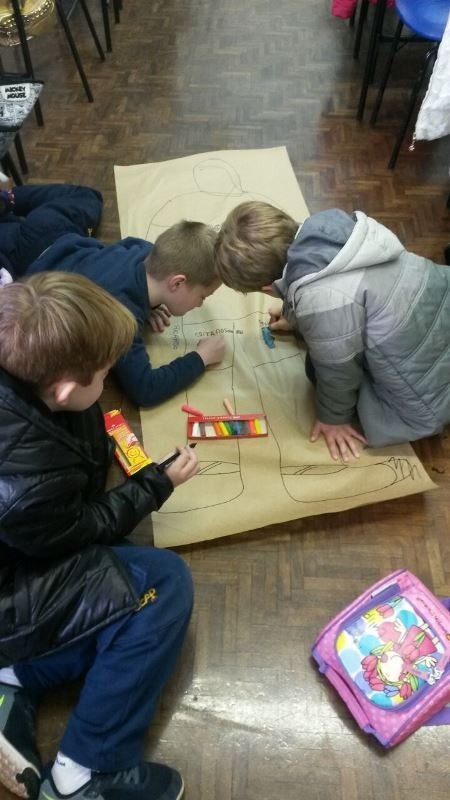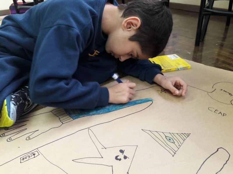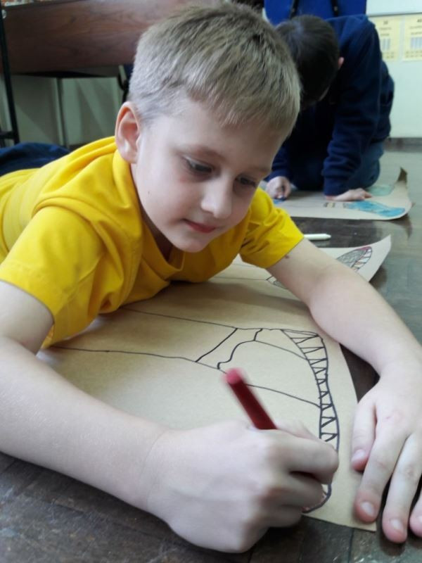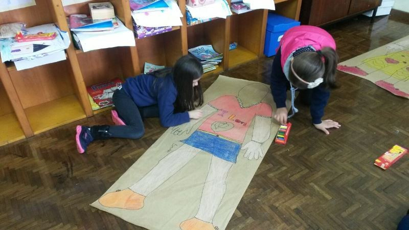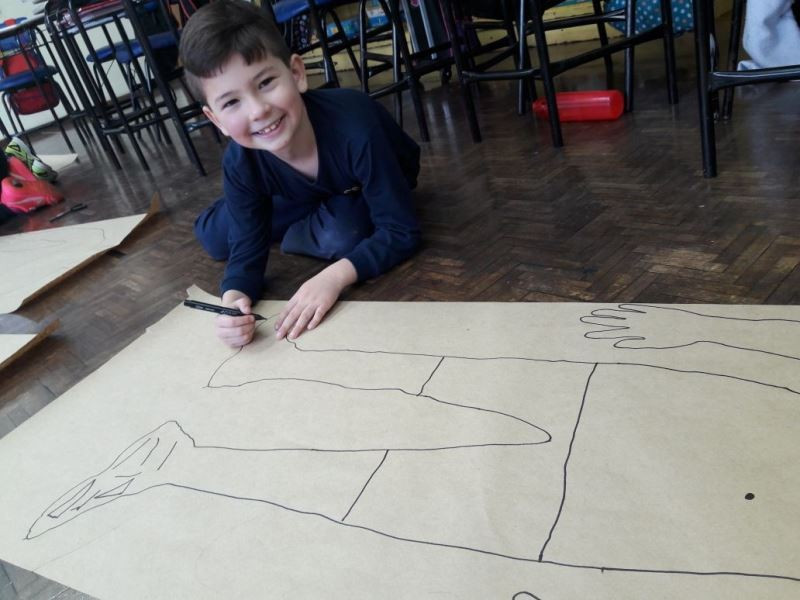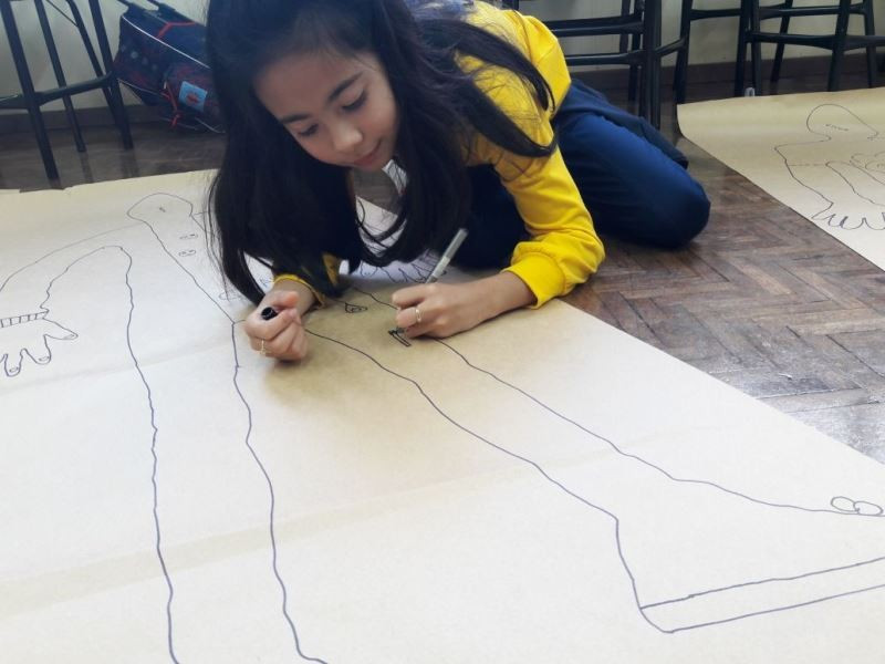 Os alunos do 2º ano do Ensino Fundamental seguem explorando a literatura “E algo aconteceu naquele dia”, de Jonas Ribeiro. A ideia da corrente do bem está tendo sequência, agora, com uma atividade que irá culminar com uma grande exposição. Cada criança fez, em papel pardo, o contorno do próprio corpo, em tamanho natural. Estão criando detalhes, roupas, acessórios e colorindo. E com todos os desenhos irão representar a corrente do bem da turma, significando amizade, ajuda e companheirismo. A exposição será durante o CEAP Literário.
