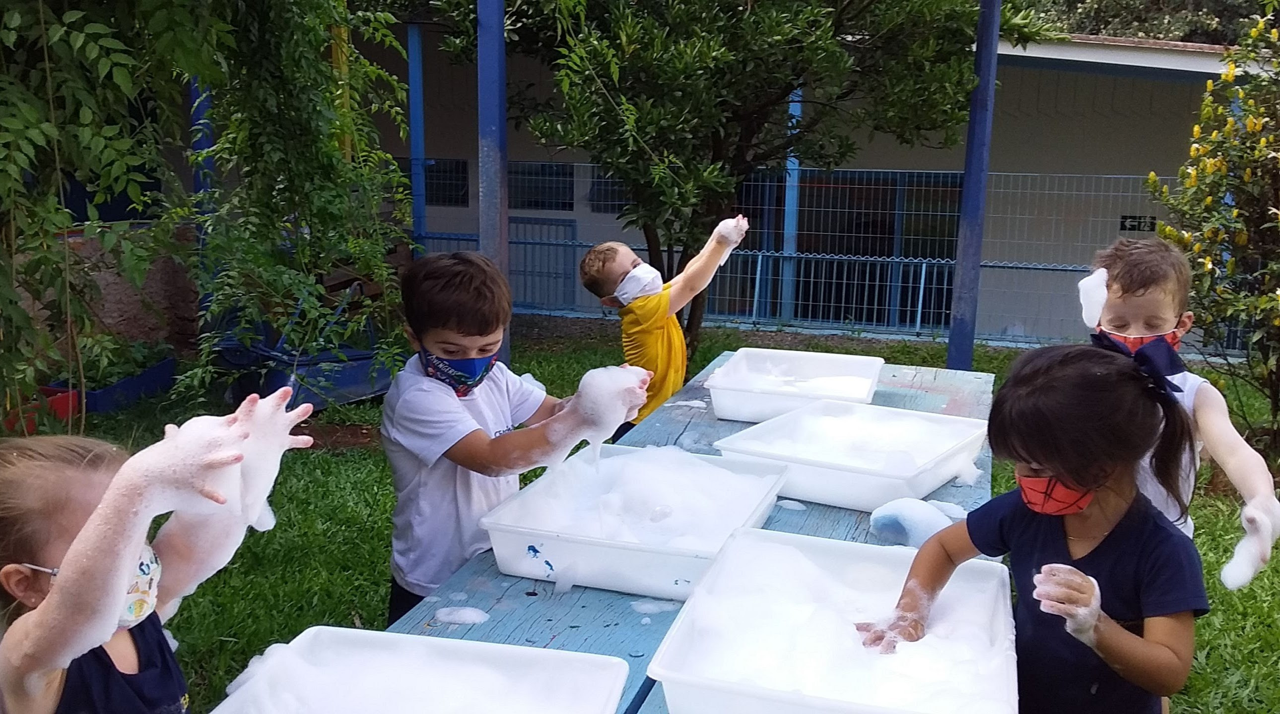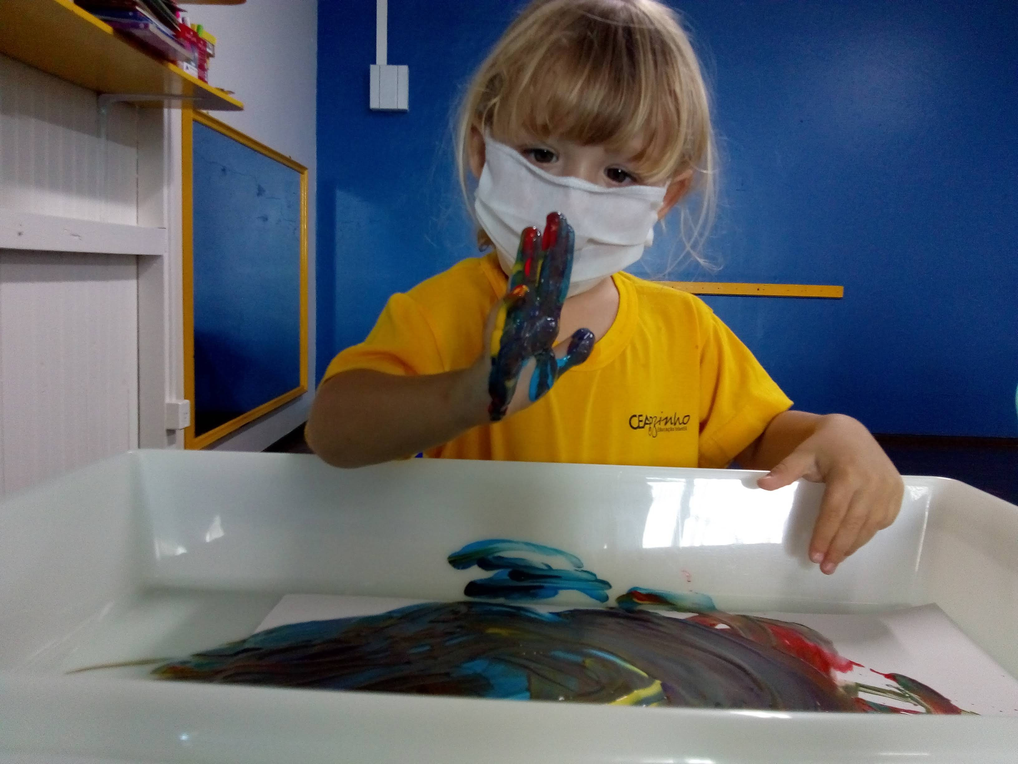 Após o tempo necessário e o respeito a singularidade cada uma vai explorando livremente, no papel, na mesa, dentro da bacia de contexto e até mesmo em seu corpo, descobrindo maneiras diferentes de misturar e brincar com o material. Esse momento é rico, cheio de significados importantíssimos para o seu desenvolvimento e se faz essencial o olhar e a escuta das professoras, pois é durante essas interações que as mesmas irão refletir sobre as aprendizagens, num processo de interlocução com suas fundamentações e abordagens metodológicas, para planejar.