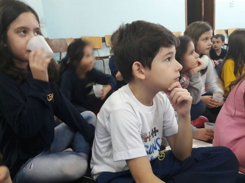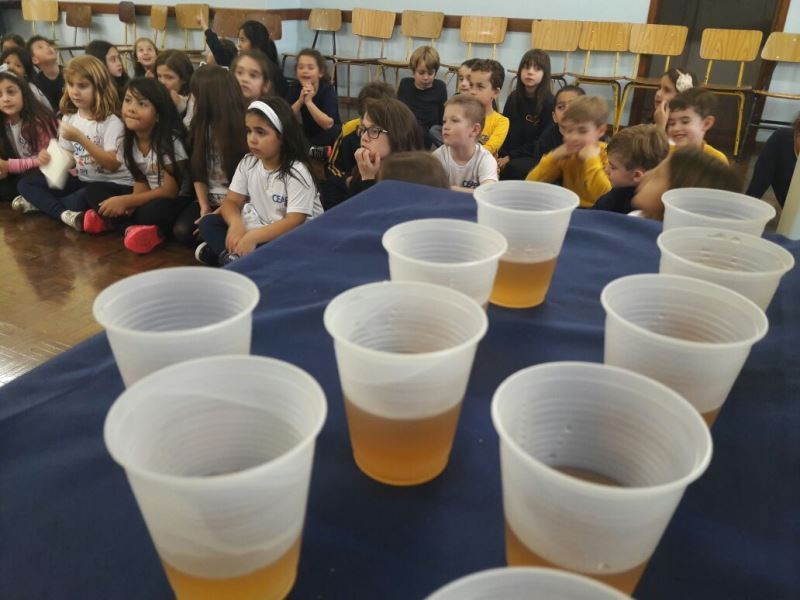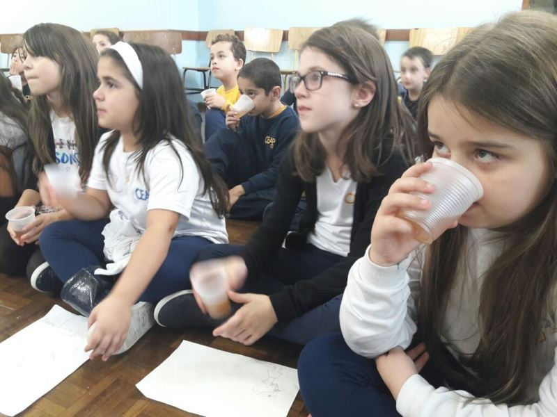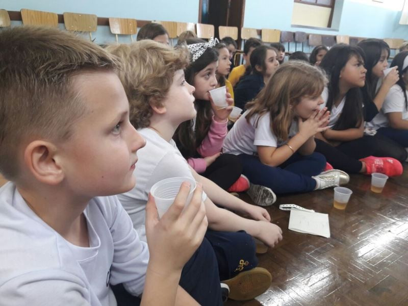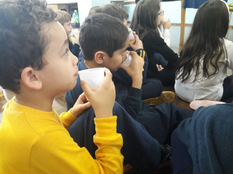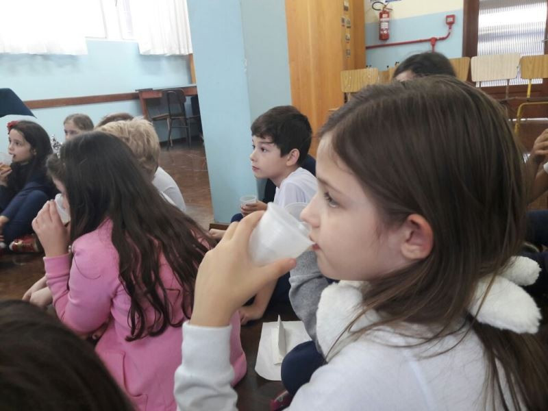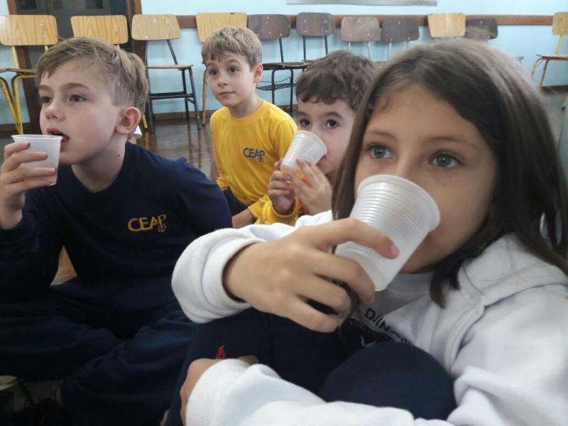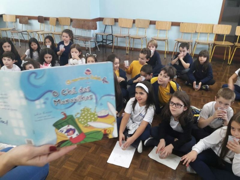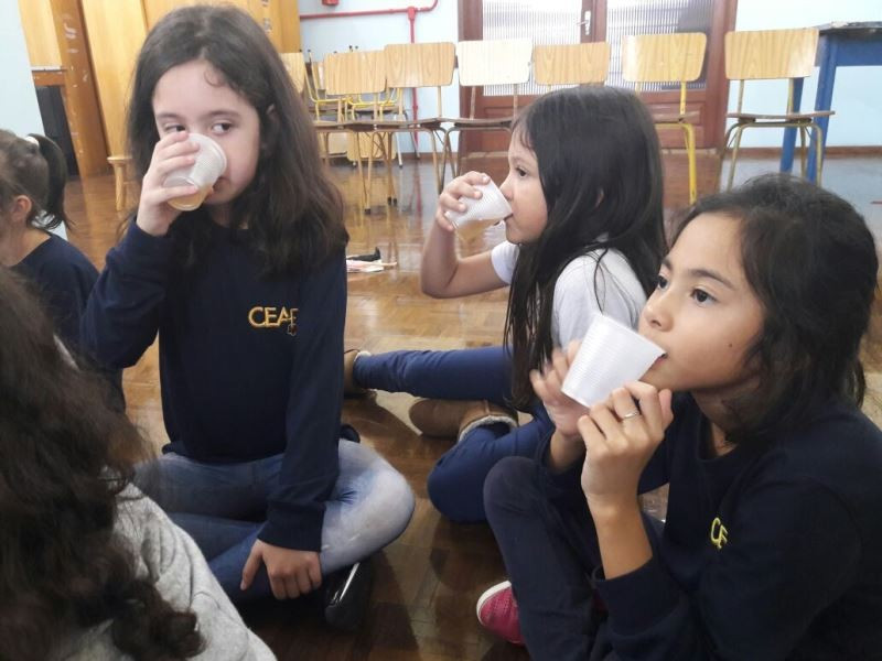 Depois do plantio de mudas de macieira e erva-mate no Campo do CEAP, as turmas do 2º ano do Ensino Fundamental tiveram, na escola, outras vivências relacionadas ao estudo sobe as plantas. As crianças leram um texto e fizeram o registro das plantas e suas funções. Depois, na Sala 100, fizeram – e degustaram – chá de maçã, relacionando a vivência à prática do plantio da macieira. Enquanto degustavam o chá, ouviram a história “O chá das maravilhas”, de Léia Cassol. Nas próximas aulas irão explorar essa literatura e continuar o estudo das plantas.