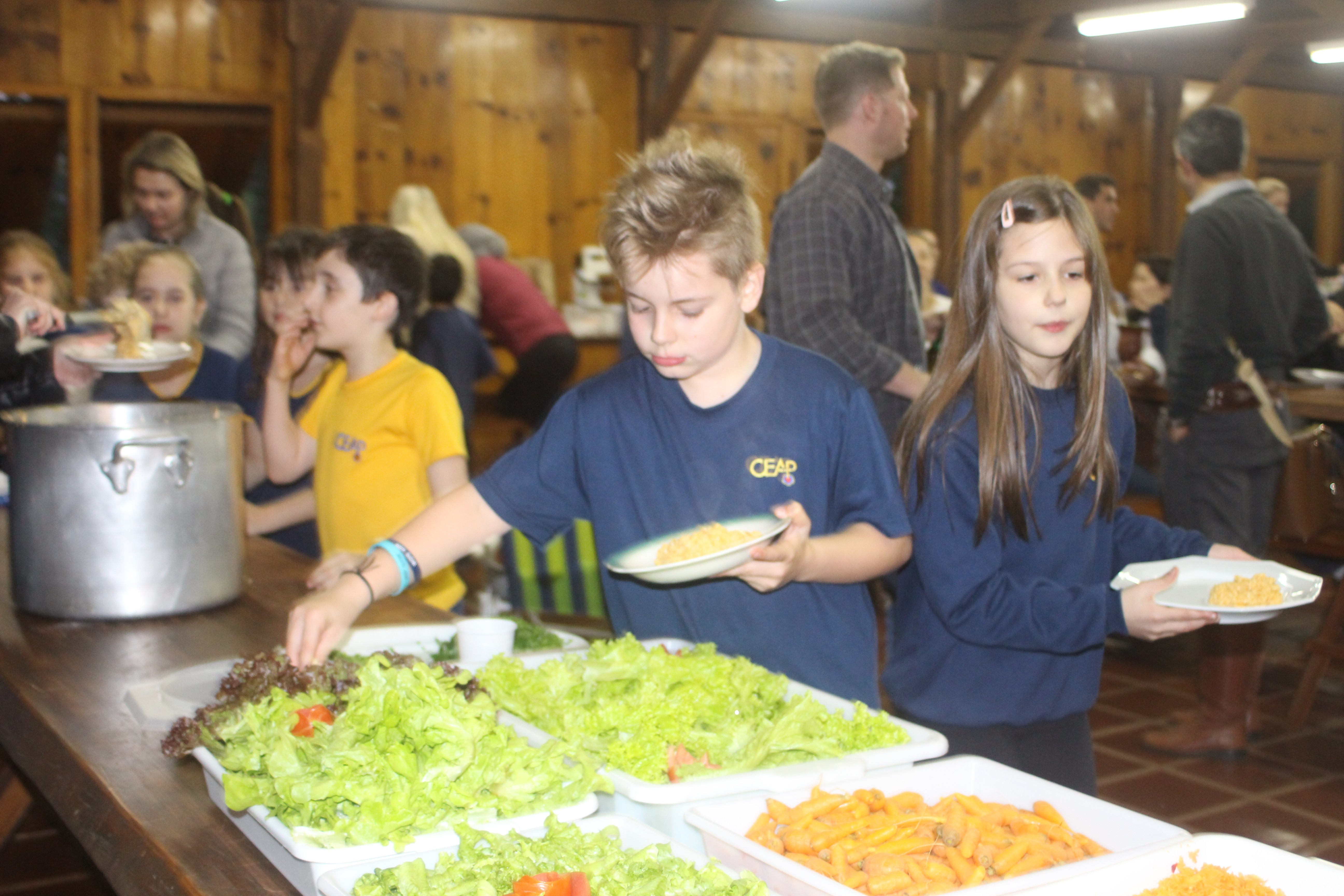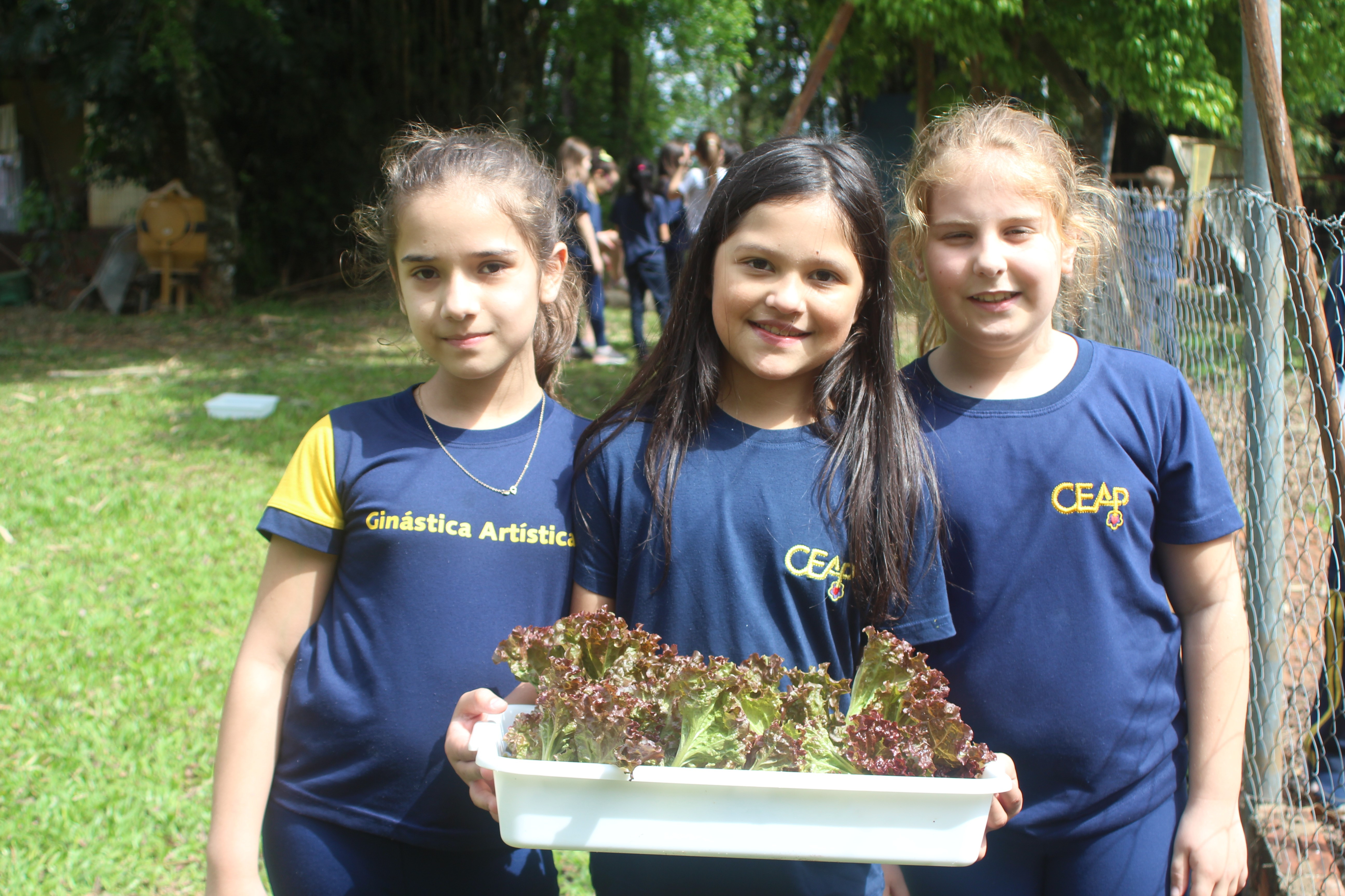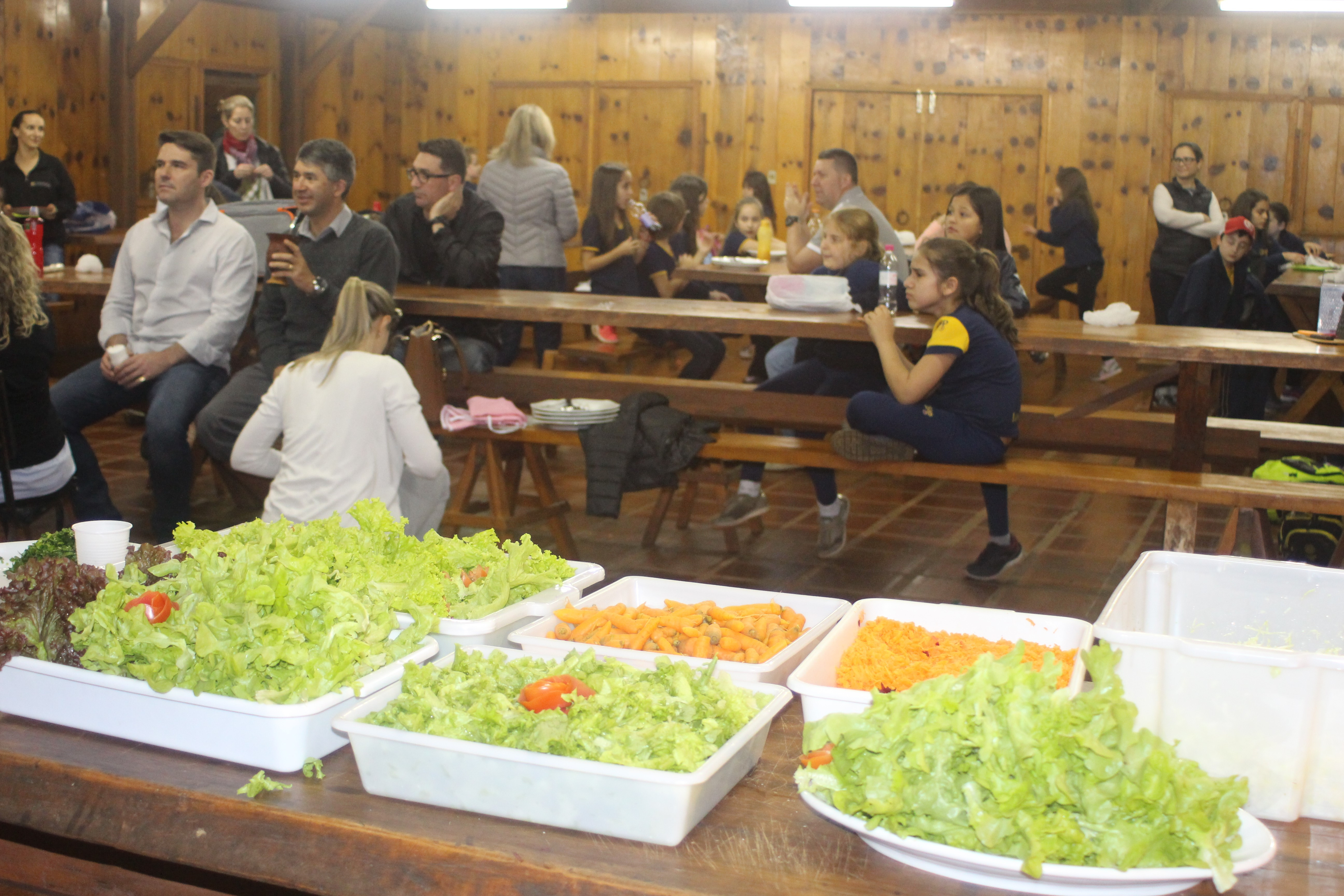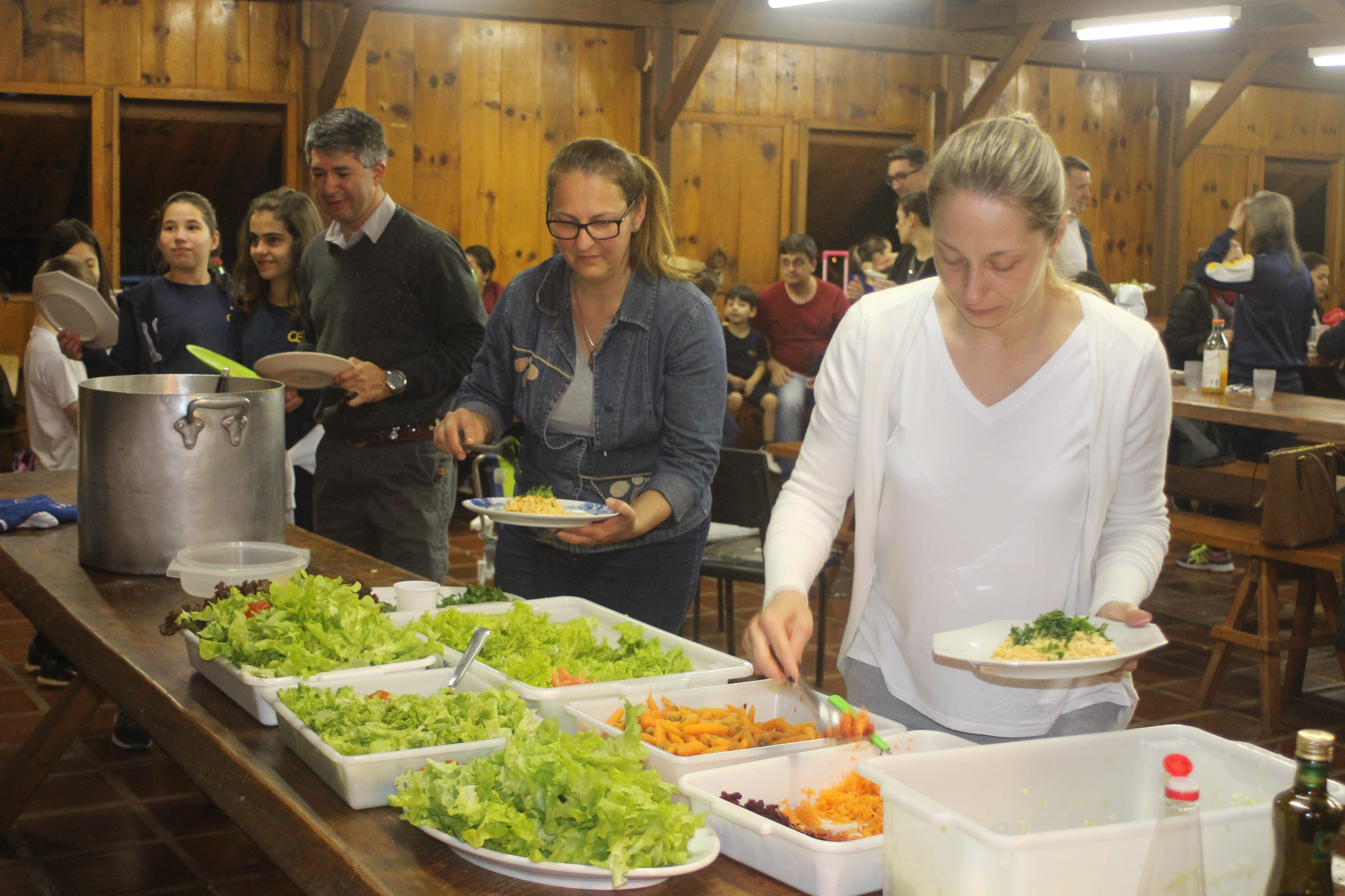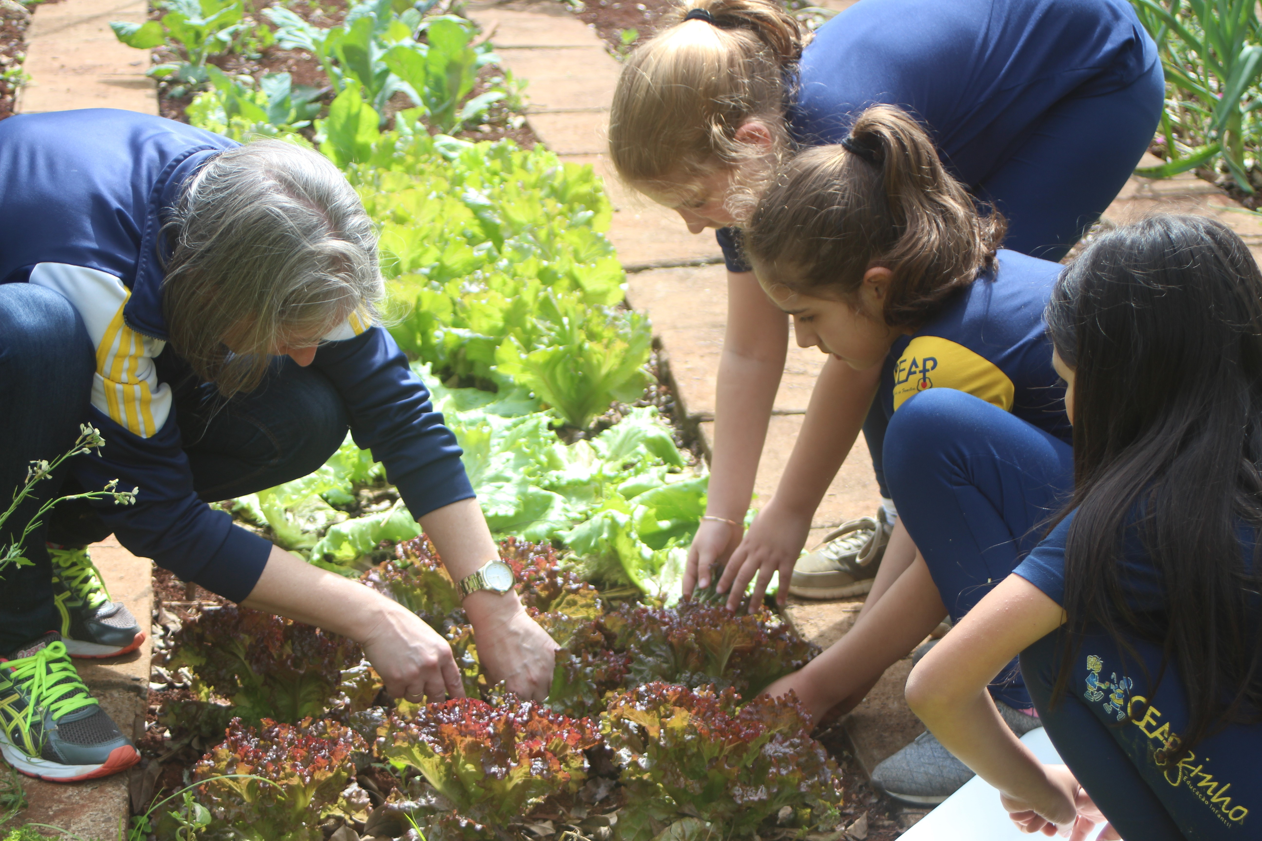 A alegria da colheita estava estampada nos sorrisos. E para confraternizar convidaram os pais para comerem as saladinhas acompanhadas de um delicioso risoto, feito pelas voluntárias mamães.