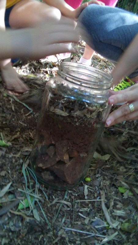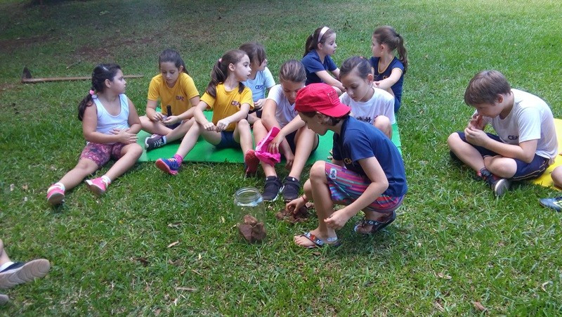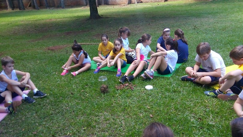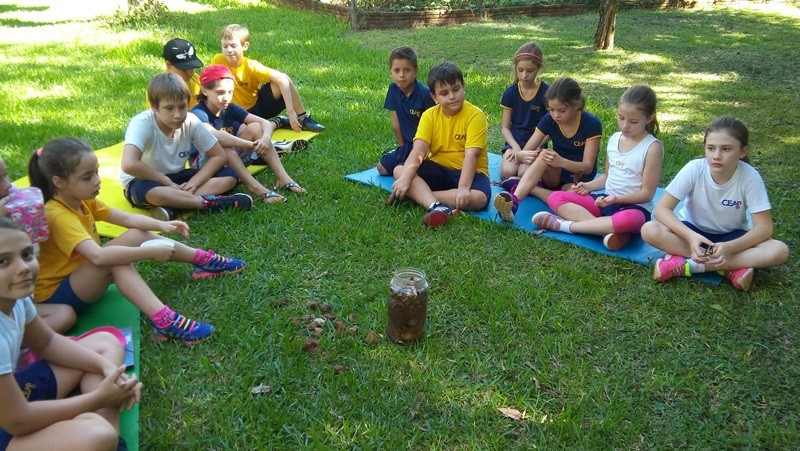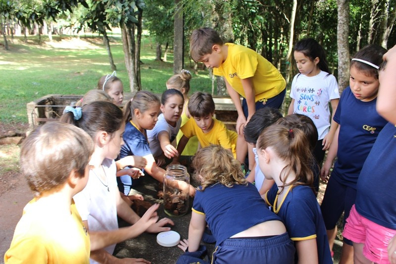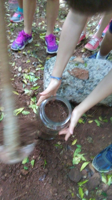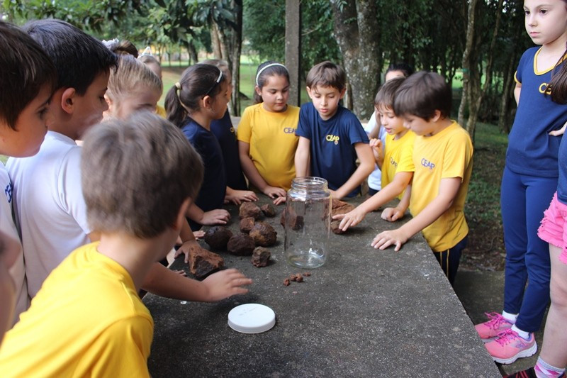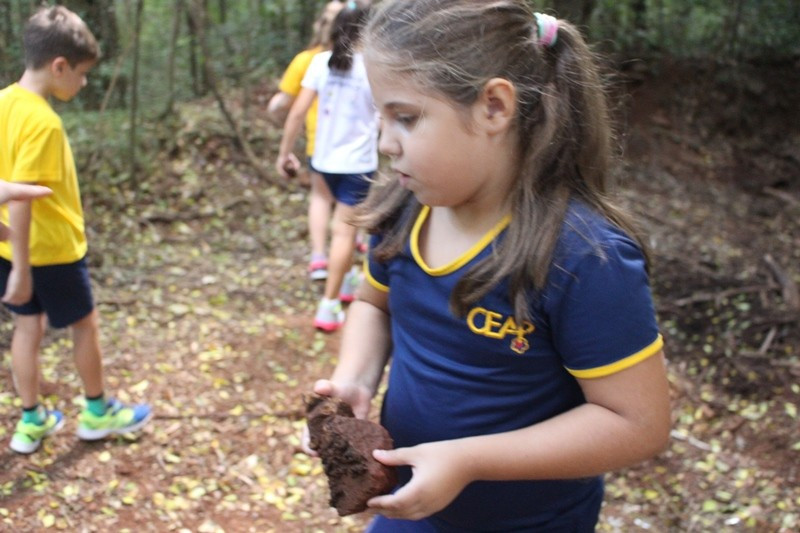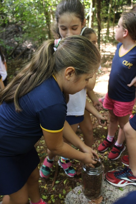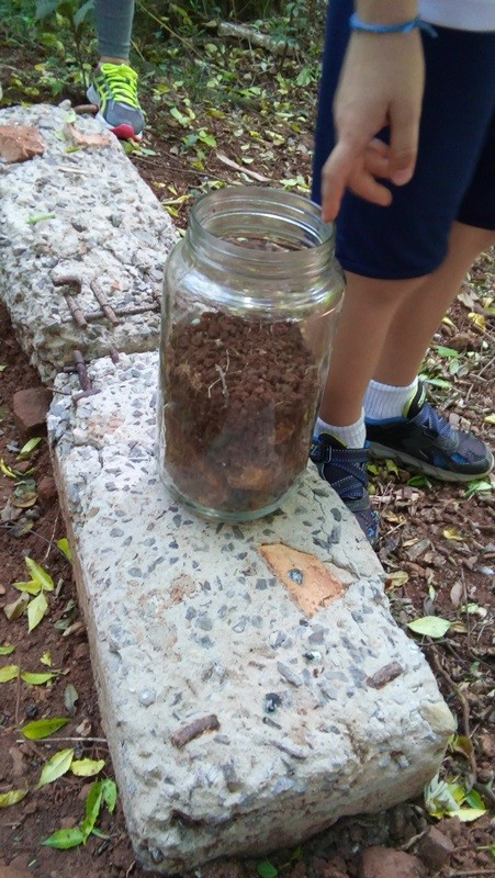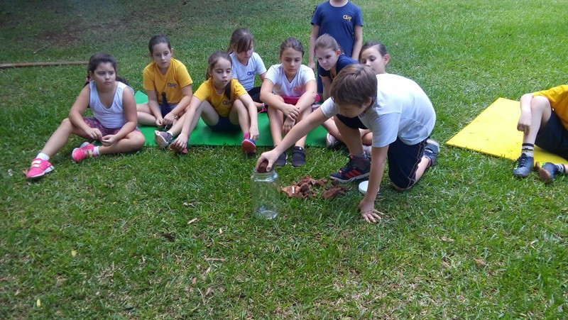 A formação do solo e os tipos diferentes de solo foram explorados em aula do 3º ano do Ensino Fundamental no Campo do CEAP. Para exemplificar a formação do solo, as professoras Bárbara Basso e Marlova Groth coletaram rochas, fragmentos de solo, materiais em decomposição e, com eles, montaram as camadas do solo em um vidro transparente.