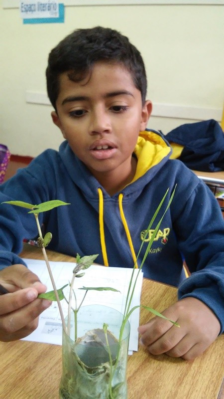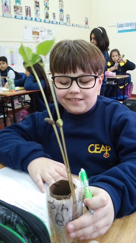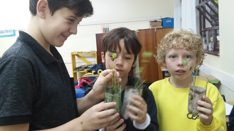 Na prática com os feijões a primeira tentativa não funcionou. Depois, contempladas todas as condições necessárias, eles puderam acompanhar a germinação e crescimento das plantas. Seguem observando o crescimento mais lento da batata doce, outra experiência de germinação que observam a cada dia, já que os germinadores estão dentro da sala de aula. Outra observação feita foi com as folhas da violeta. “Observamos que as plantas têm diferentes formas de se reproduzir, como, por exemplo, a violeta, cuja reprodução se dá pelas folhas”, explica a professora Cristiane Bertoldo.