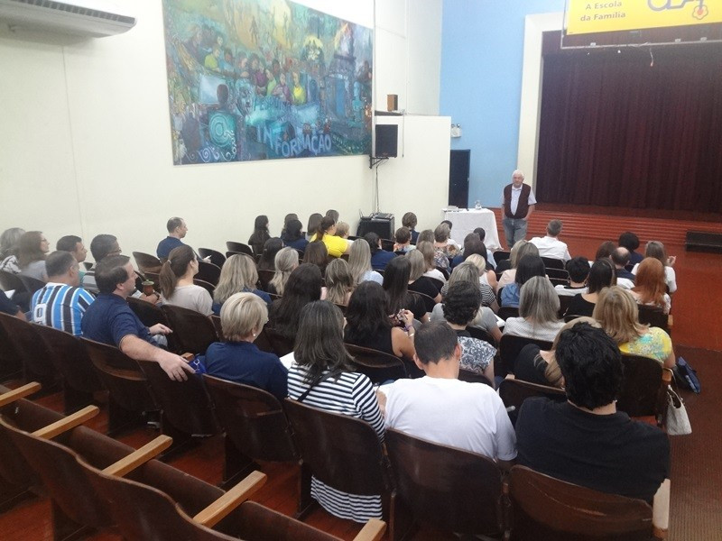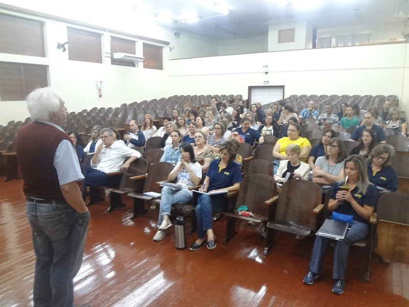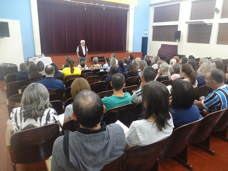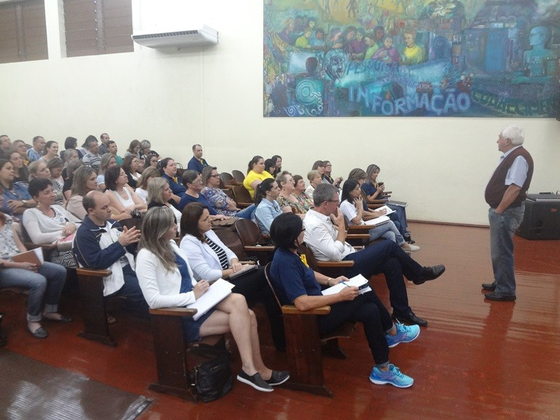 A maior parte da manhã se destinou à palestra, com vários momentos de interação dos professores, do pastor emérito da IECLB Harald Maslchitzky. Tendpo como gancho o jubileu de 500 anos da Reforma Protestante, comemorado em 2017, fez um apanhado histórico do contexto em que Martinho Lutero viveu. Apresentou tópicos da vida do monge reformador e mostrou como suas concepções foram sendo construídas para, na parte final, abordar especificamente a visão luterana para a escola.