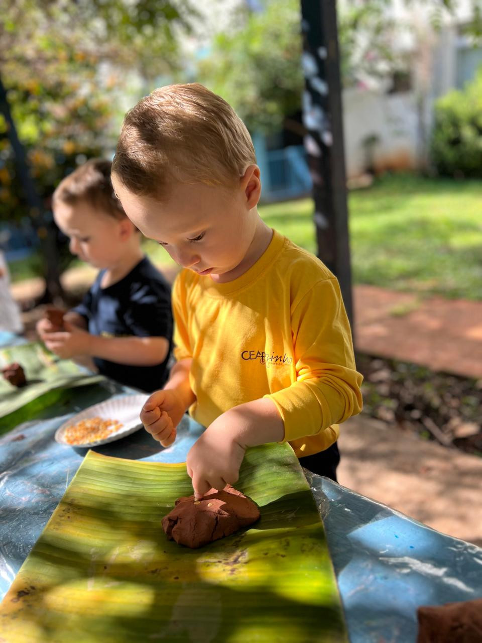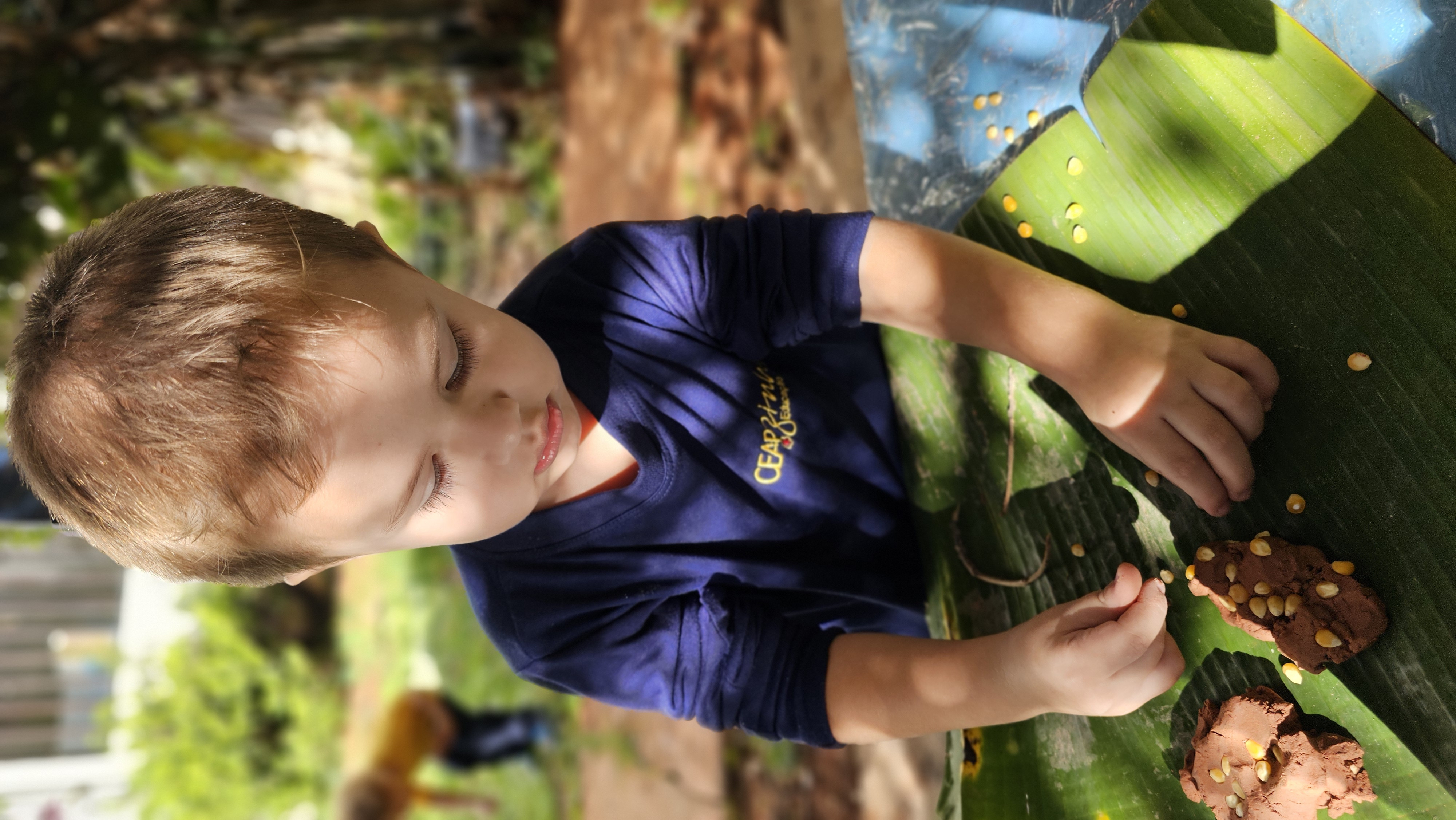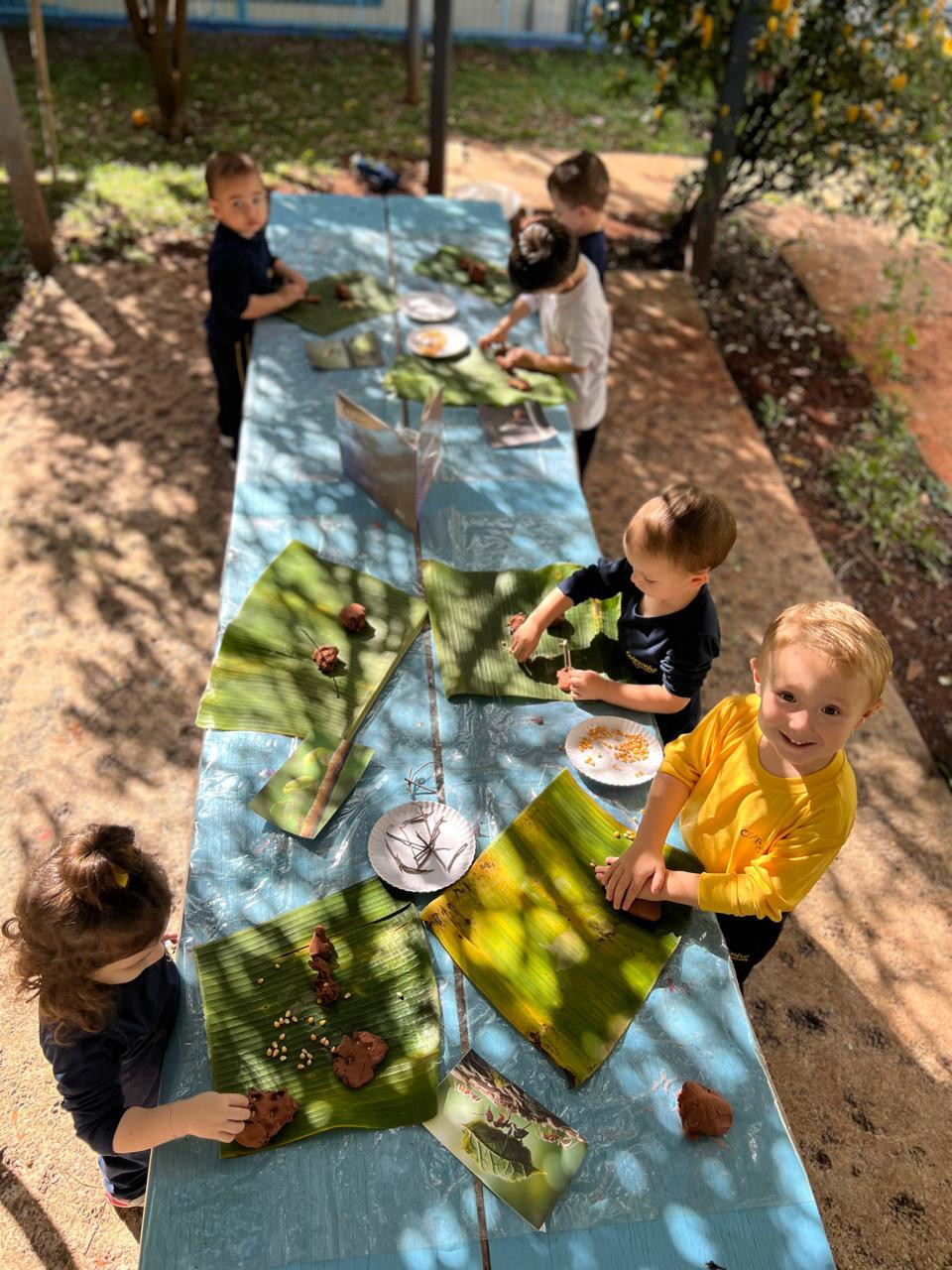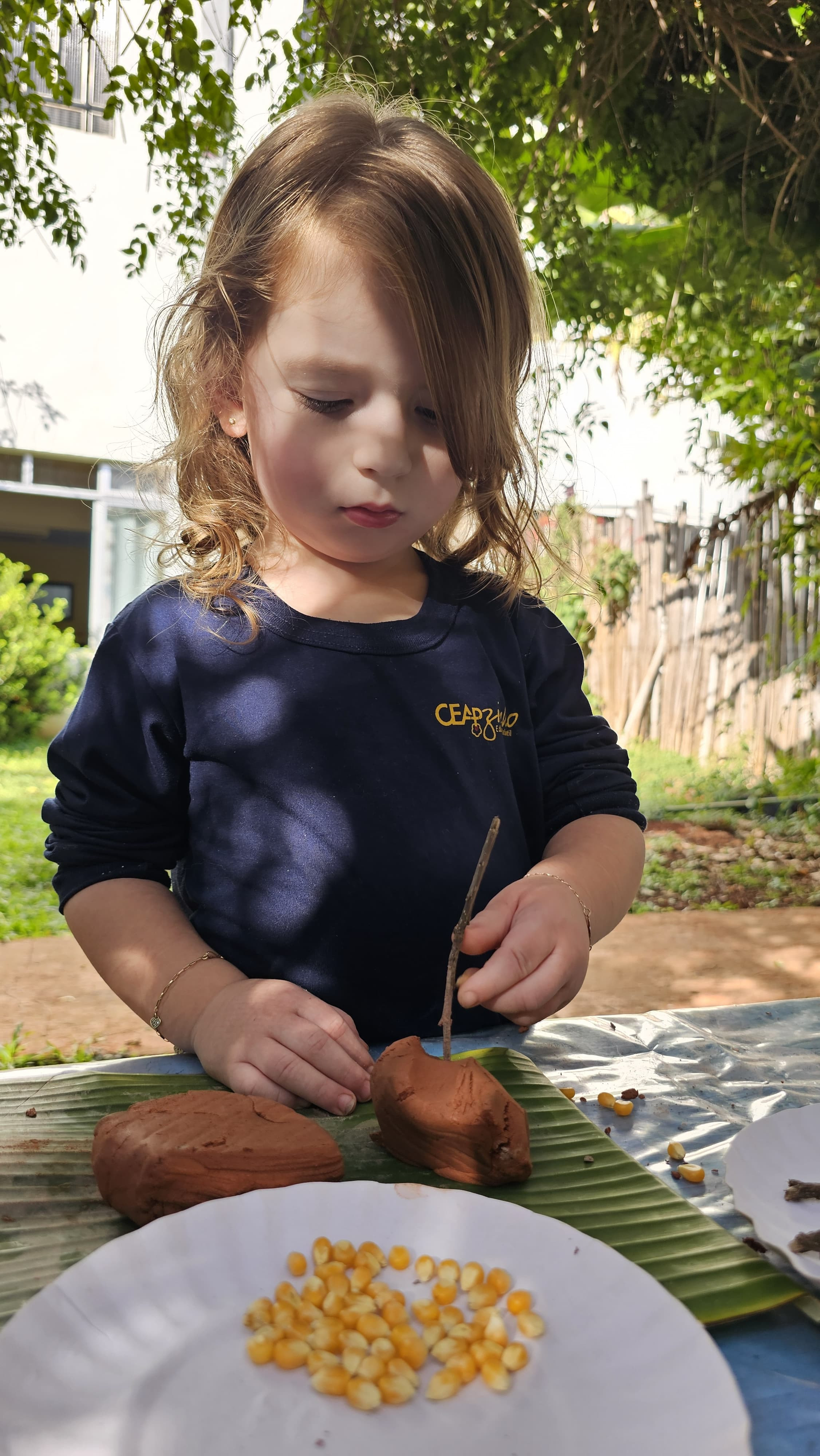 O encantamento e a criatividade permearam a vivência, cada criança, protagonista de sua produção, utilizou sementes de pipoca, feijão, soja e gravetos para compor a sua obra.